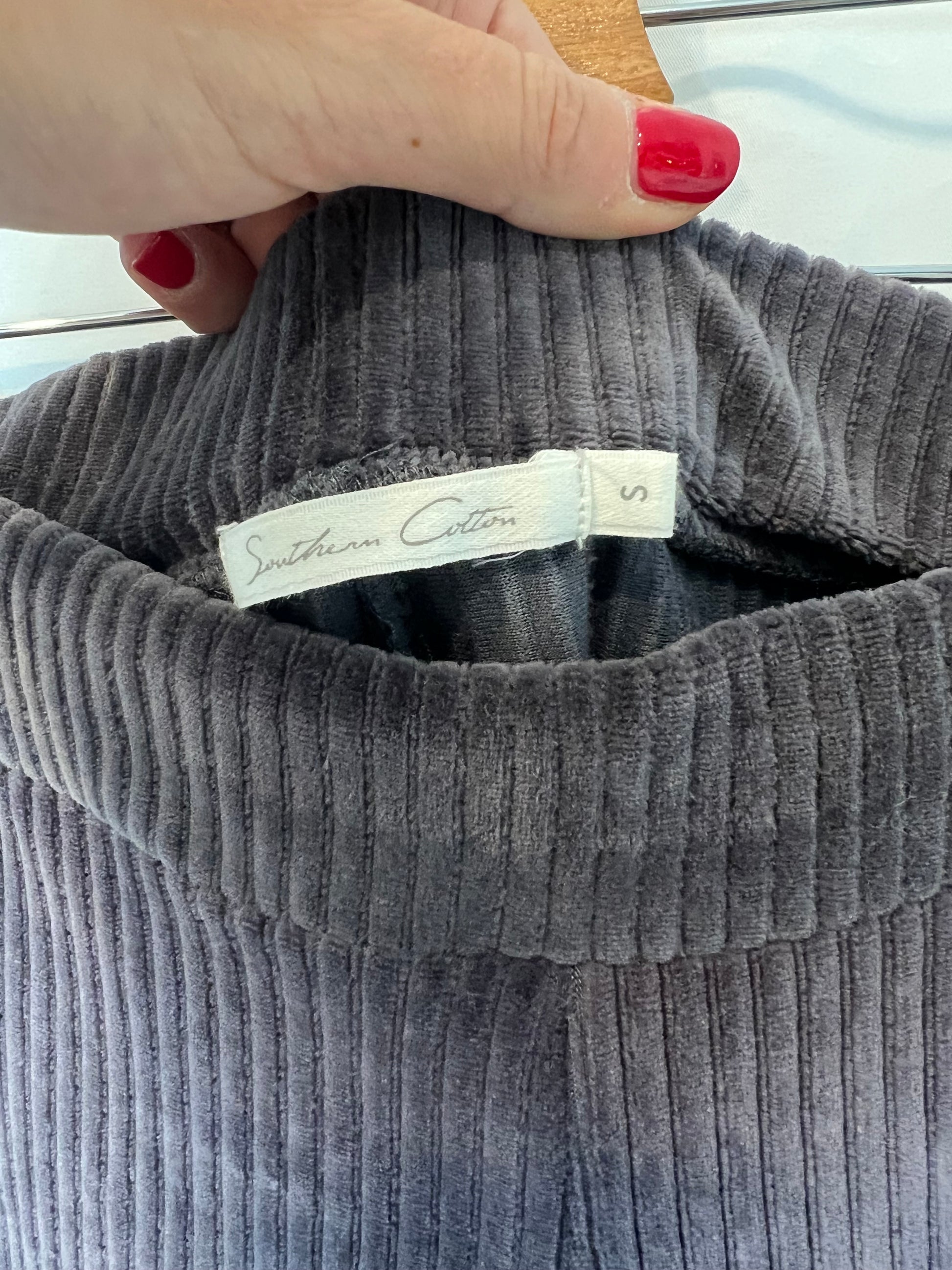Flowy grey wide-leg trousers made from velvety stretch fabric. 39cm elastic waist, 11cm long.
