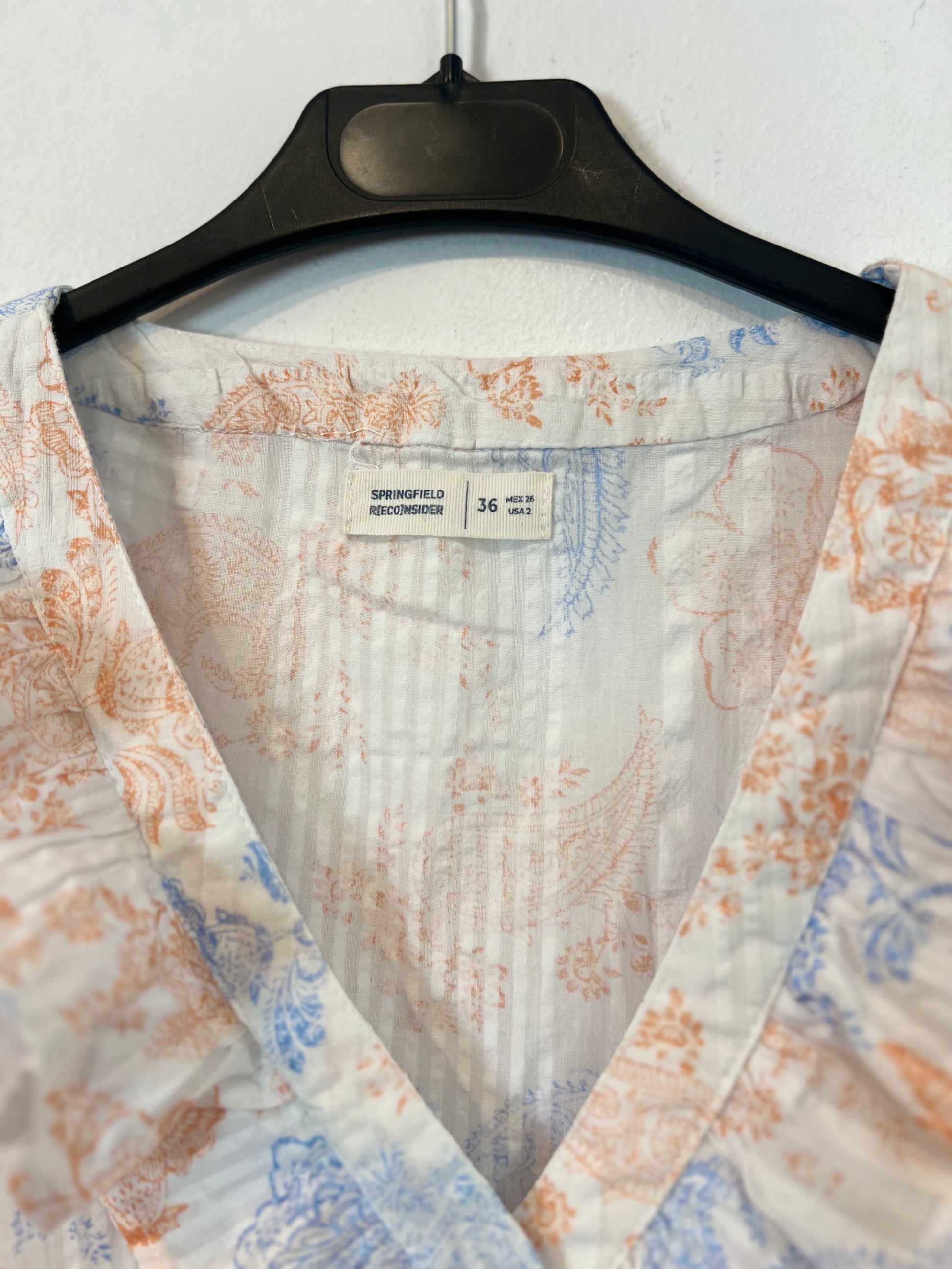 SPRINGFIELD. White blouse with blue and orange flowers, size 36