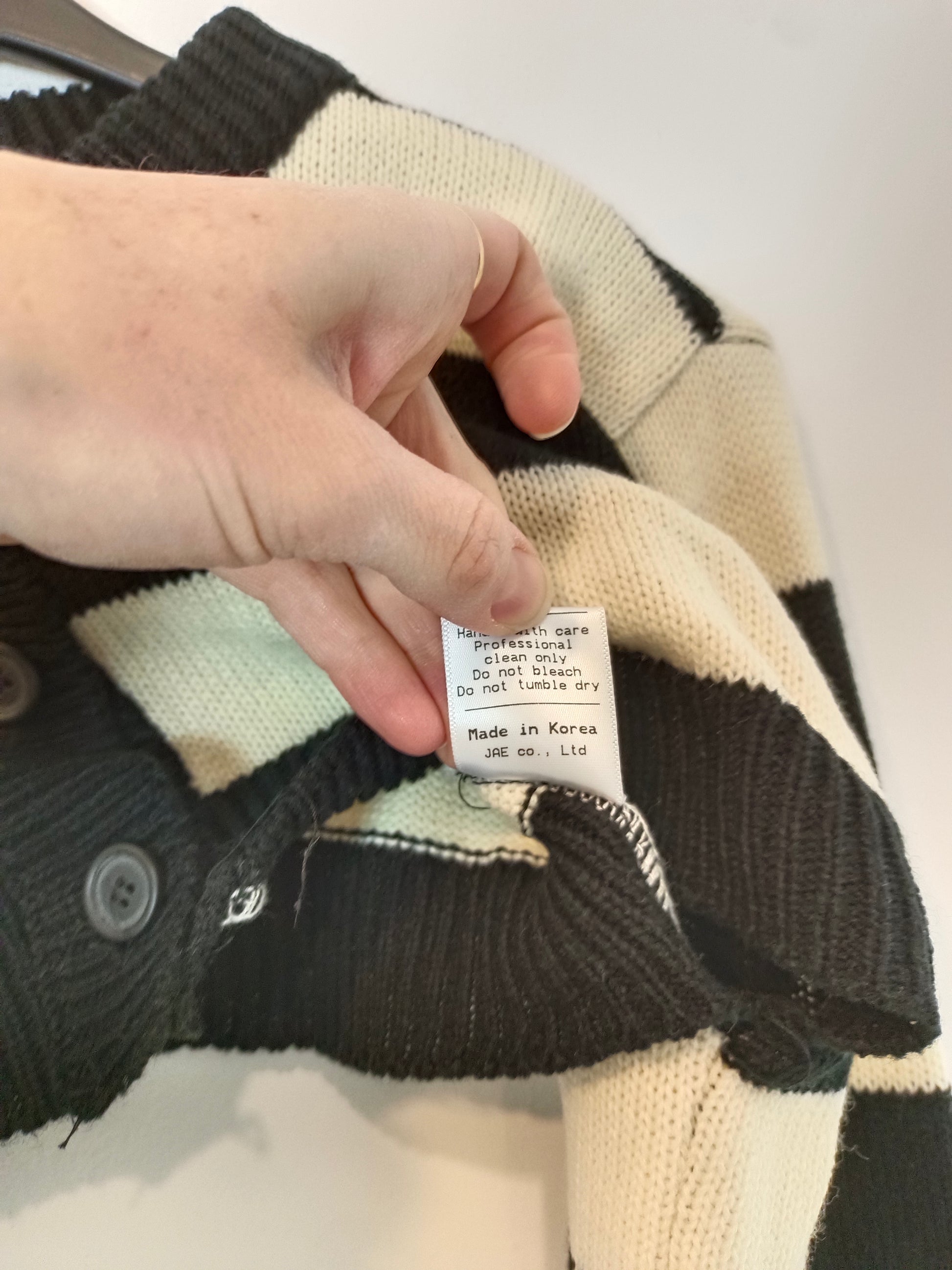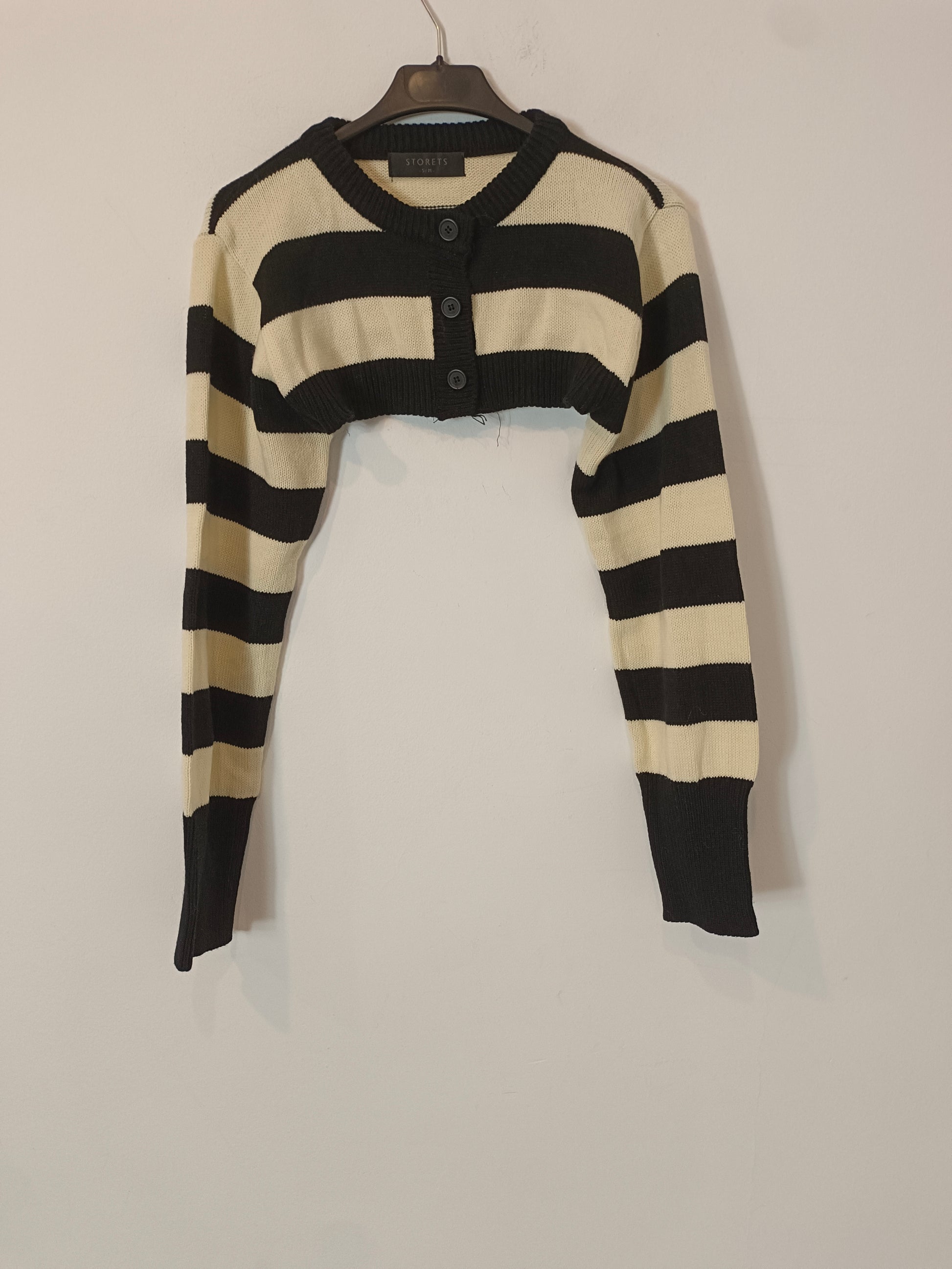 Short, black and beige striped torerita-style sweater. Length: 22 cm.