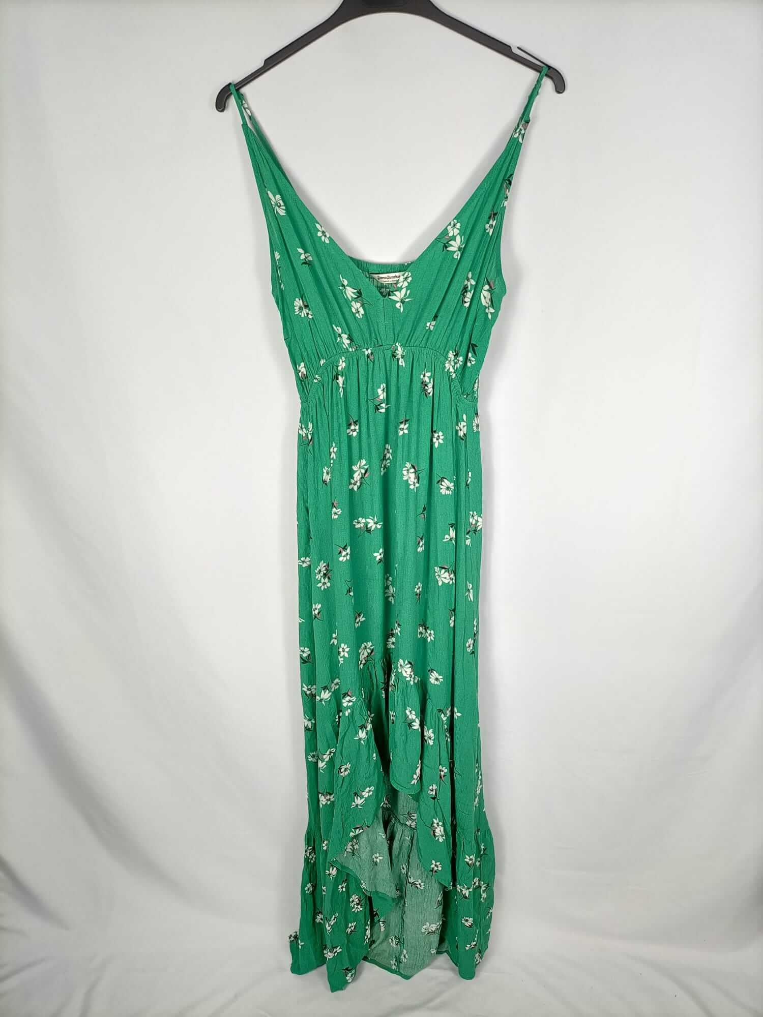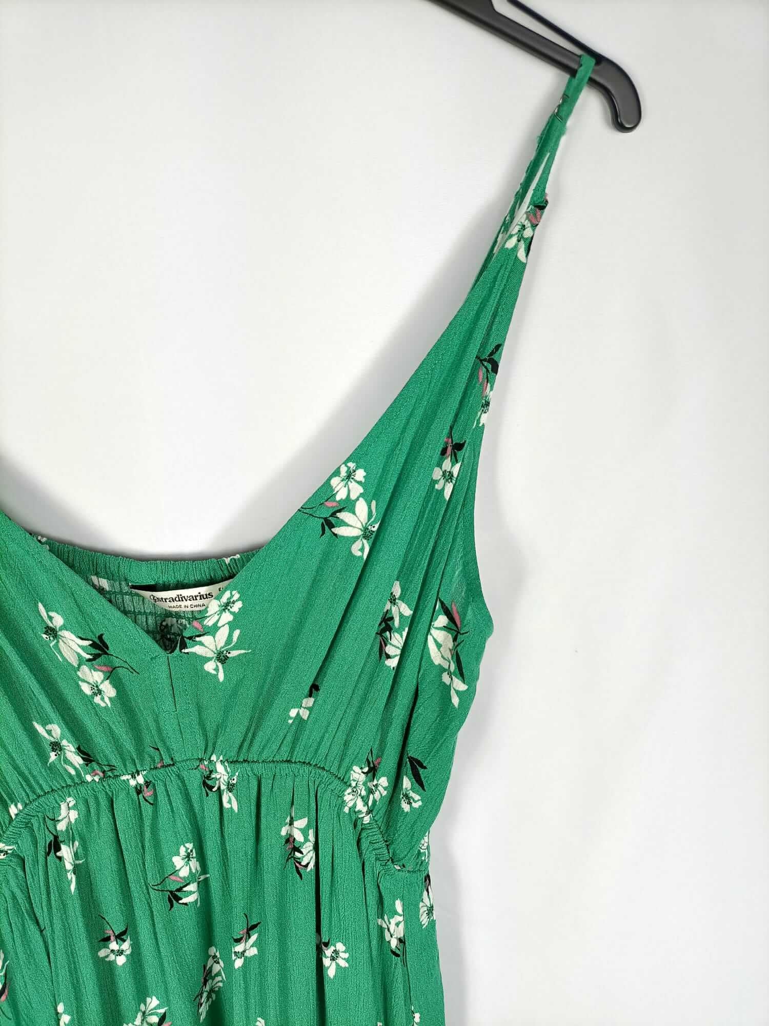 Stradivarius. Green dress with white floral print, V-neck, and asymmetric hem. Shorter at the front. Elastic back and adjustable straps. Length 147 cm.