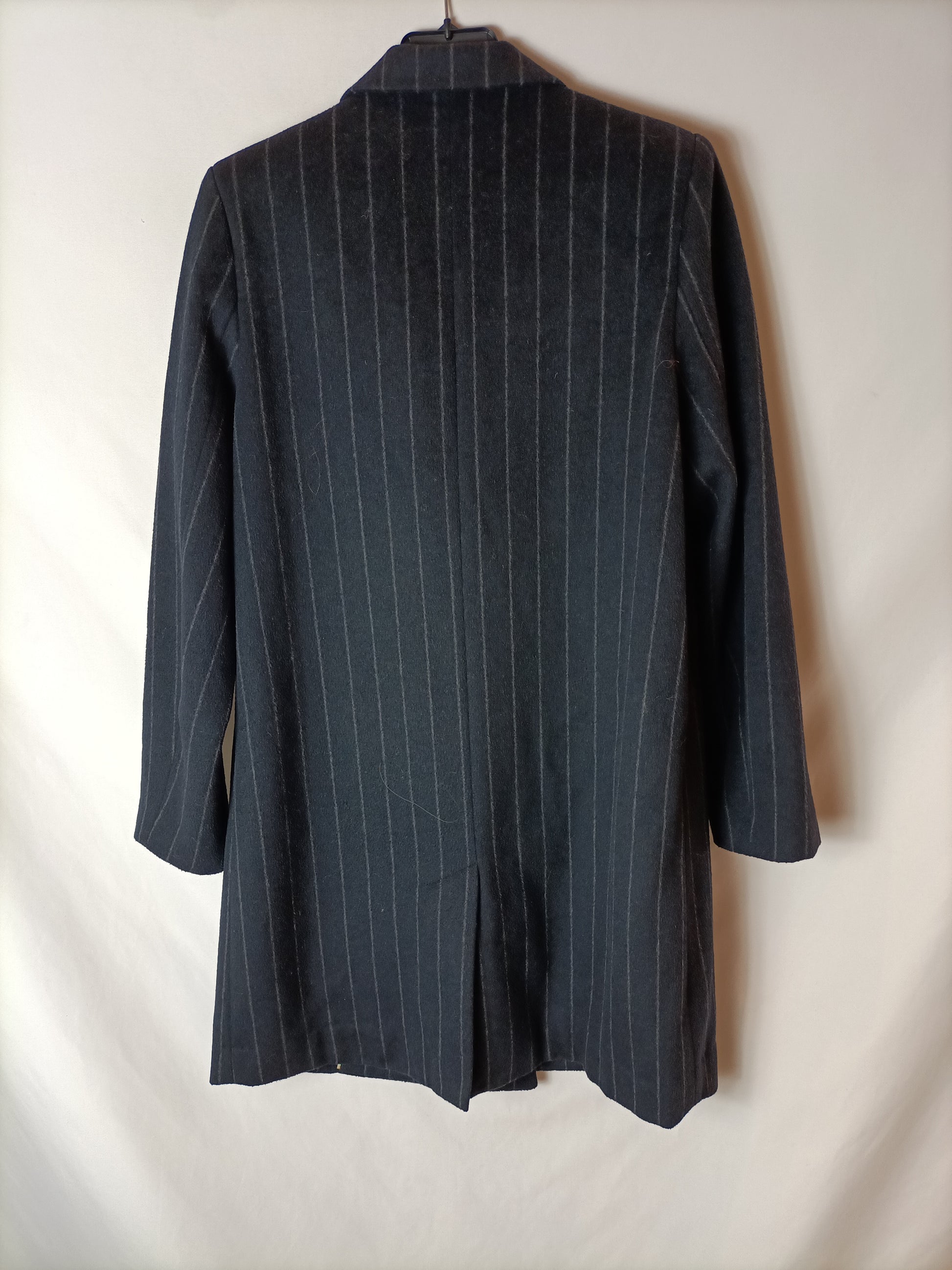 Blue cloth coat with gray pinstripe detail. 48 cm from armpit to armpit, 90 cm long.