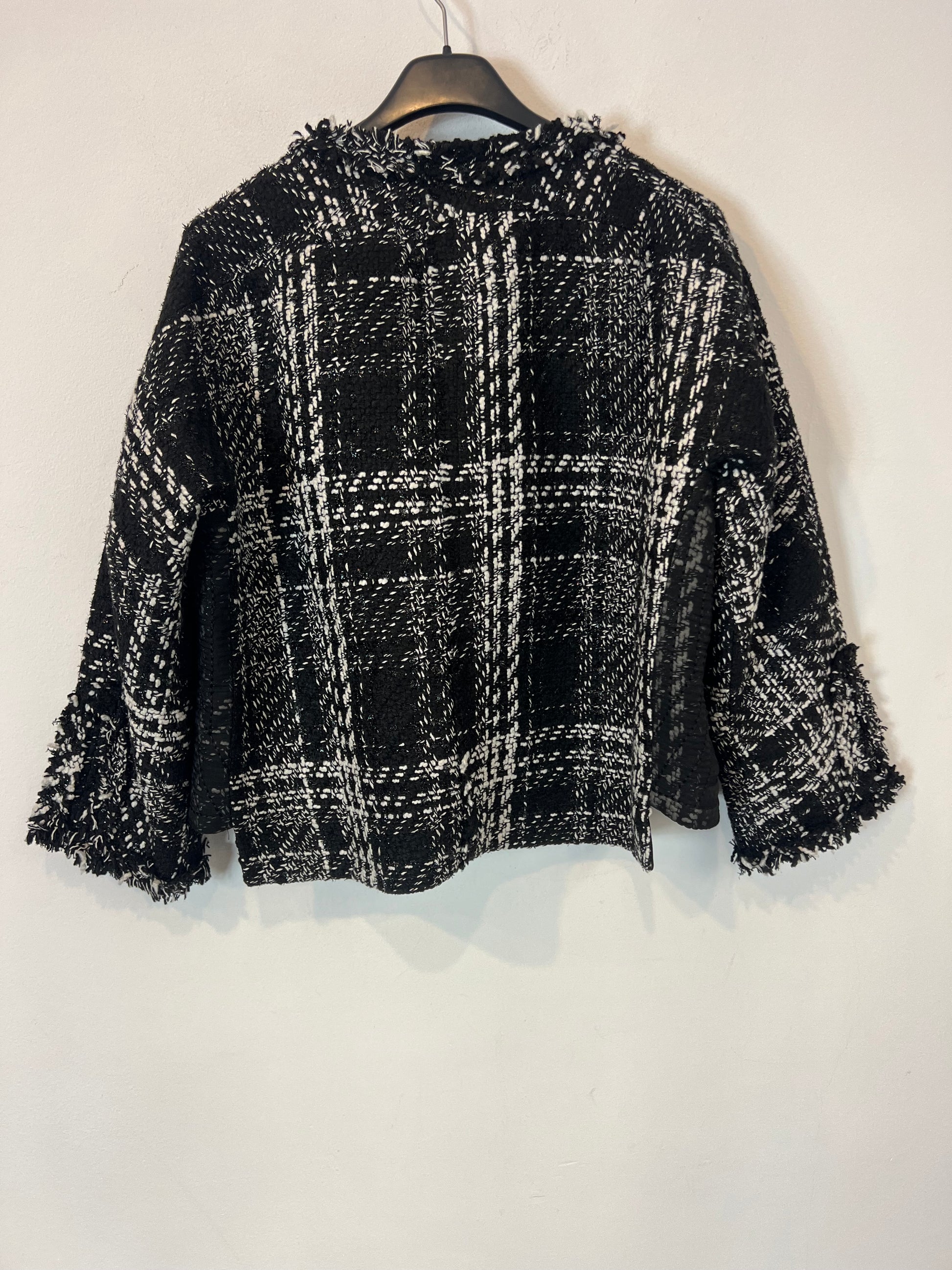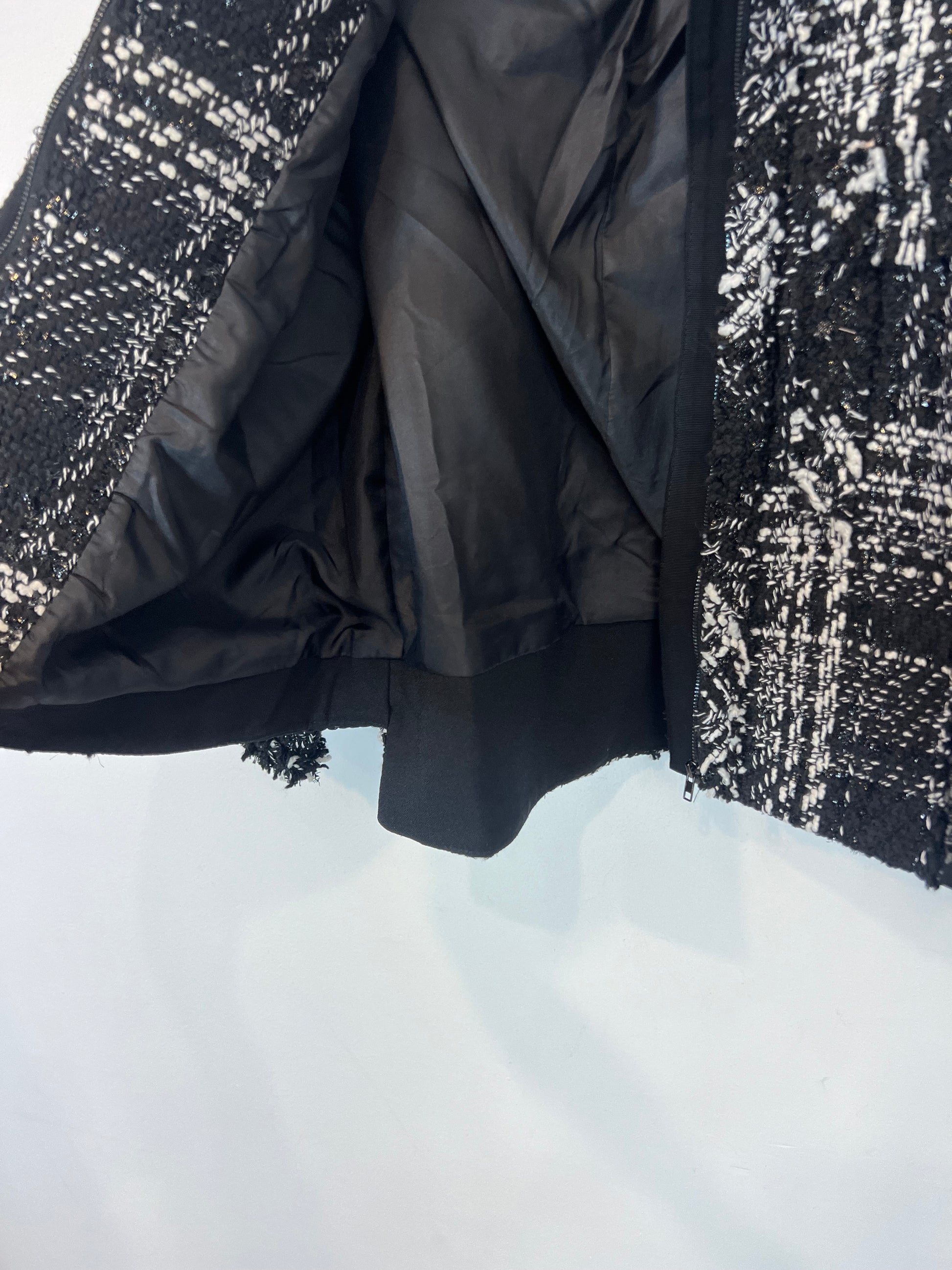Asymmetrical black and white textured tweed jacket. Back 49 cm, length 52 cm.