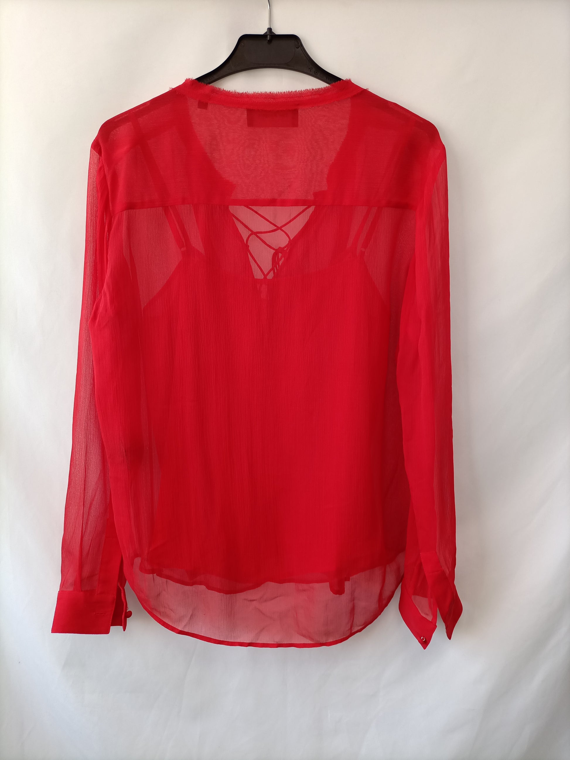 The Kooples. Red blouse with ruffles and string detailing at the neckline. Semi-sheer with adjustable straps. 71 cm long. 100% silk.