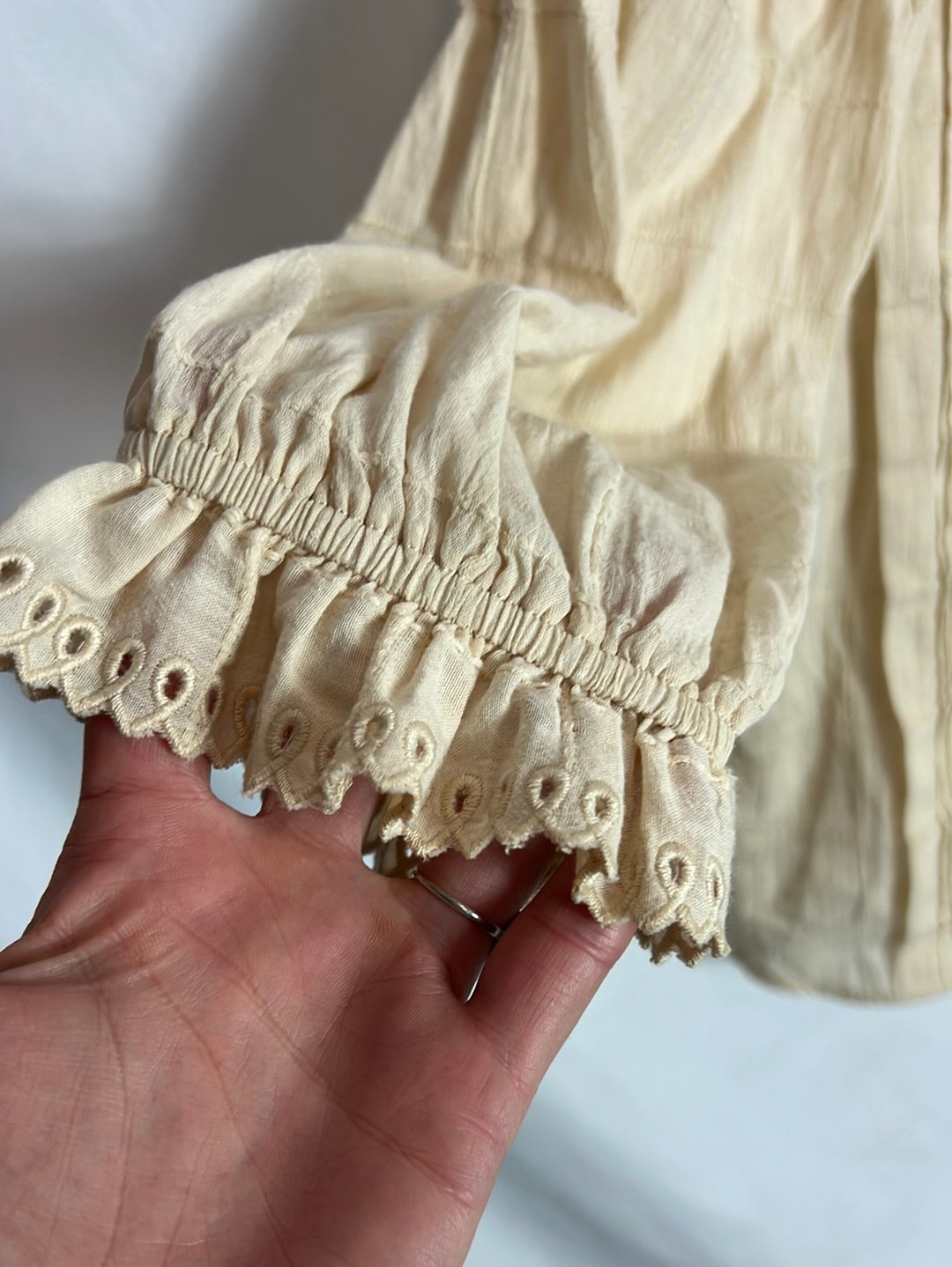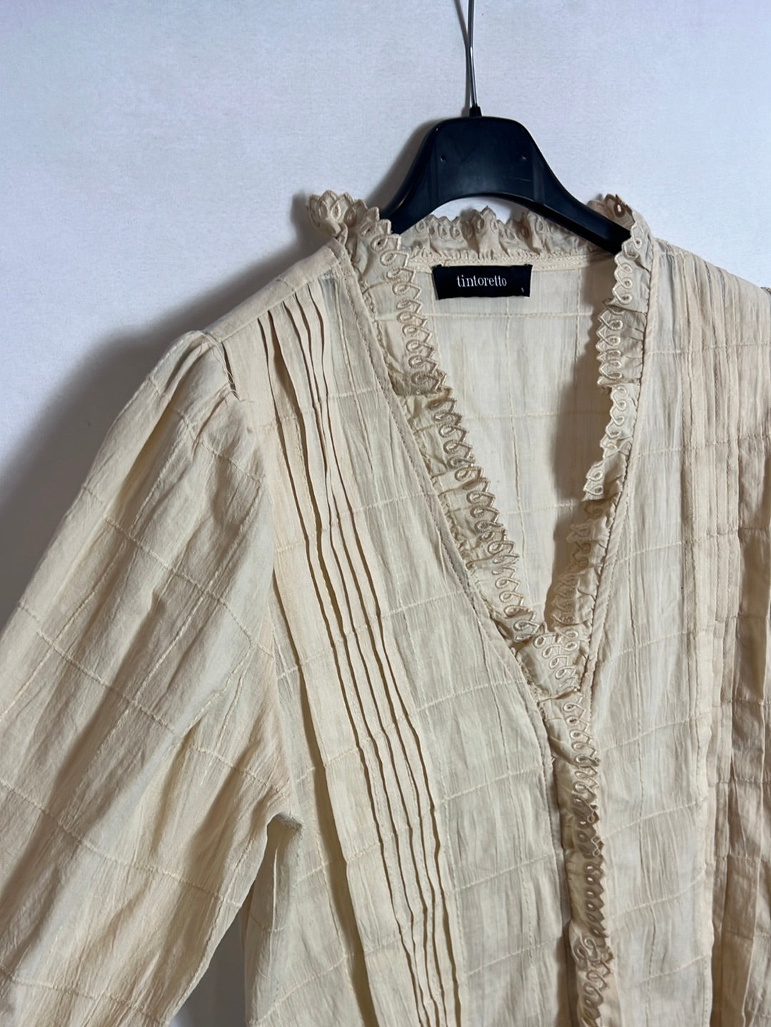 blusa beige troquelada con volante . Hombros 36cm, largo 66cm