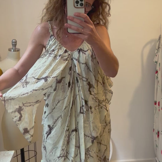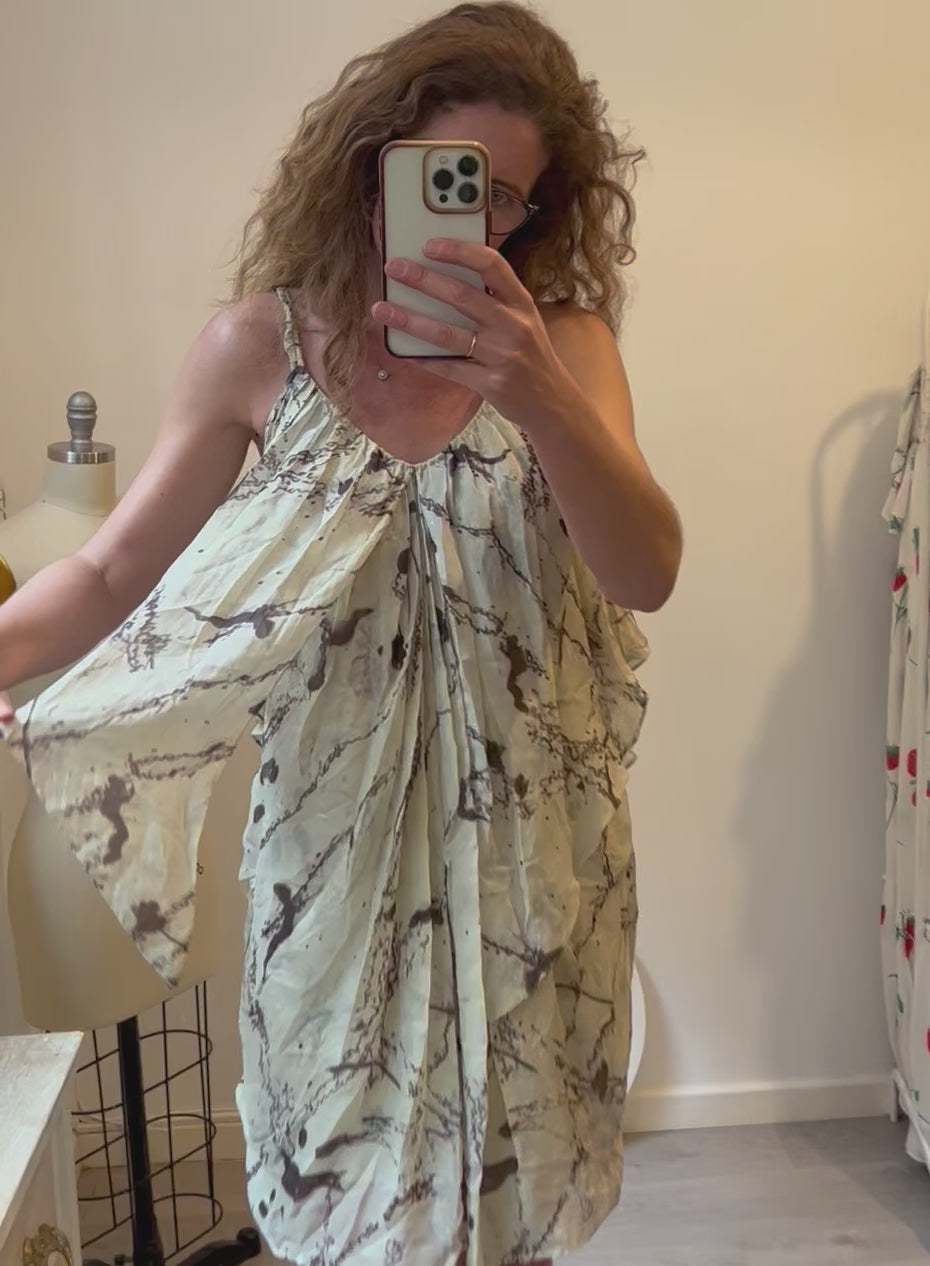 100% beige silk dress with asymmetrical print. Strap length 95cm. Multi-layered.