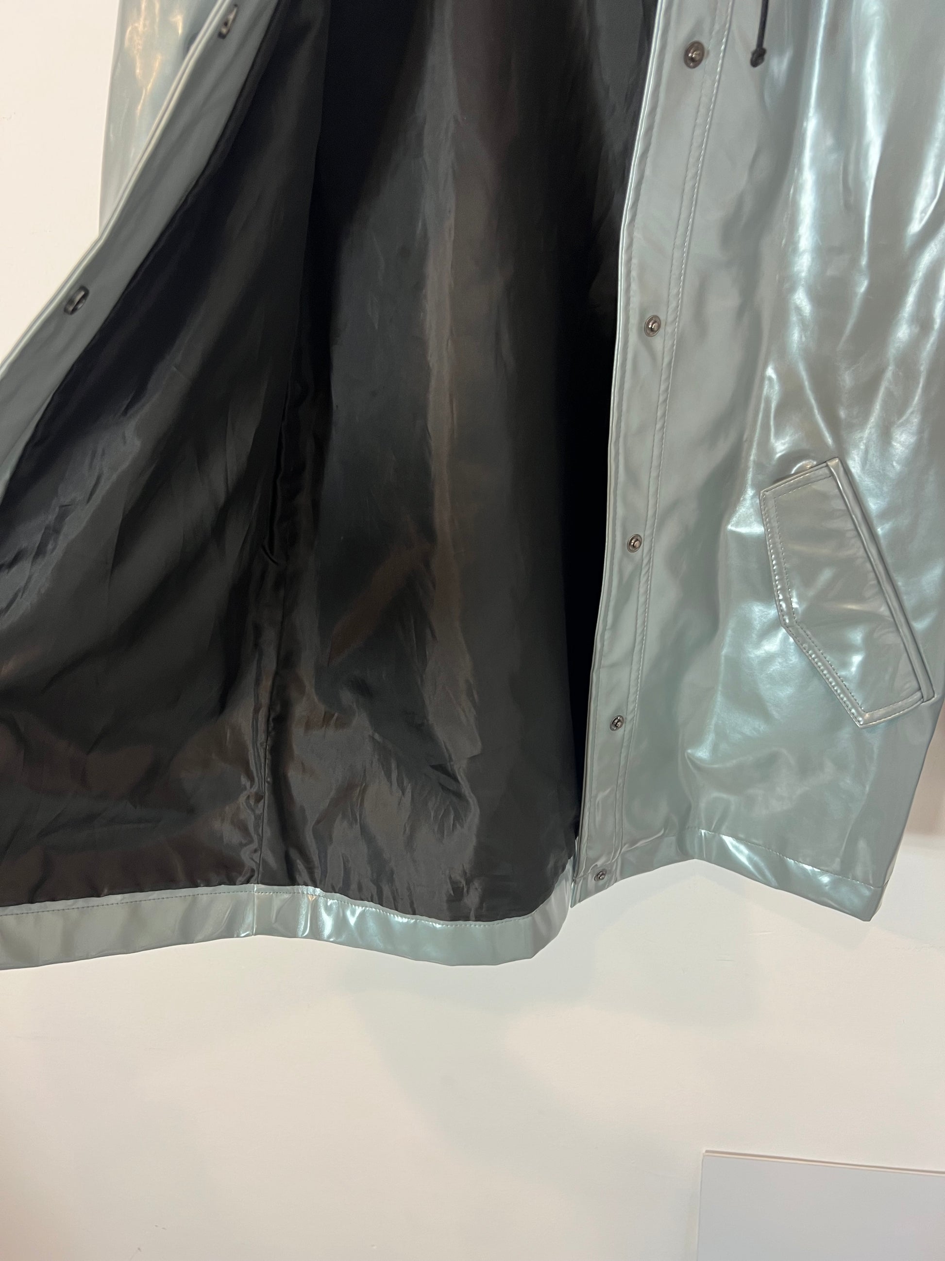 Metallic grey waterproof raincoat. Shoulders 38cm, length 73cm