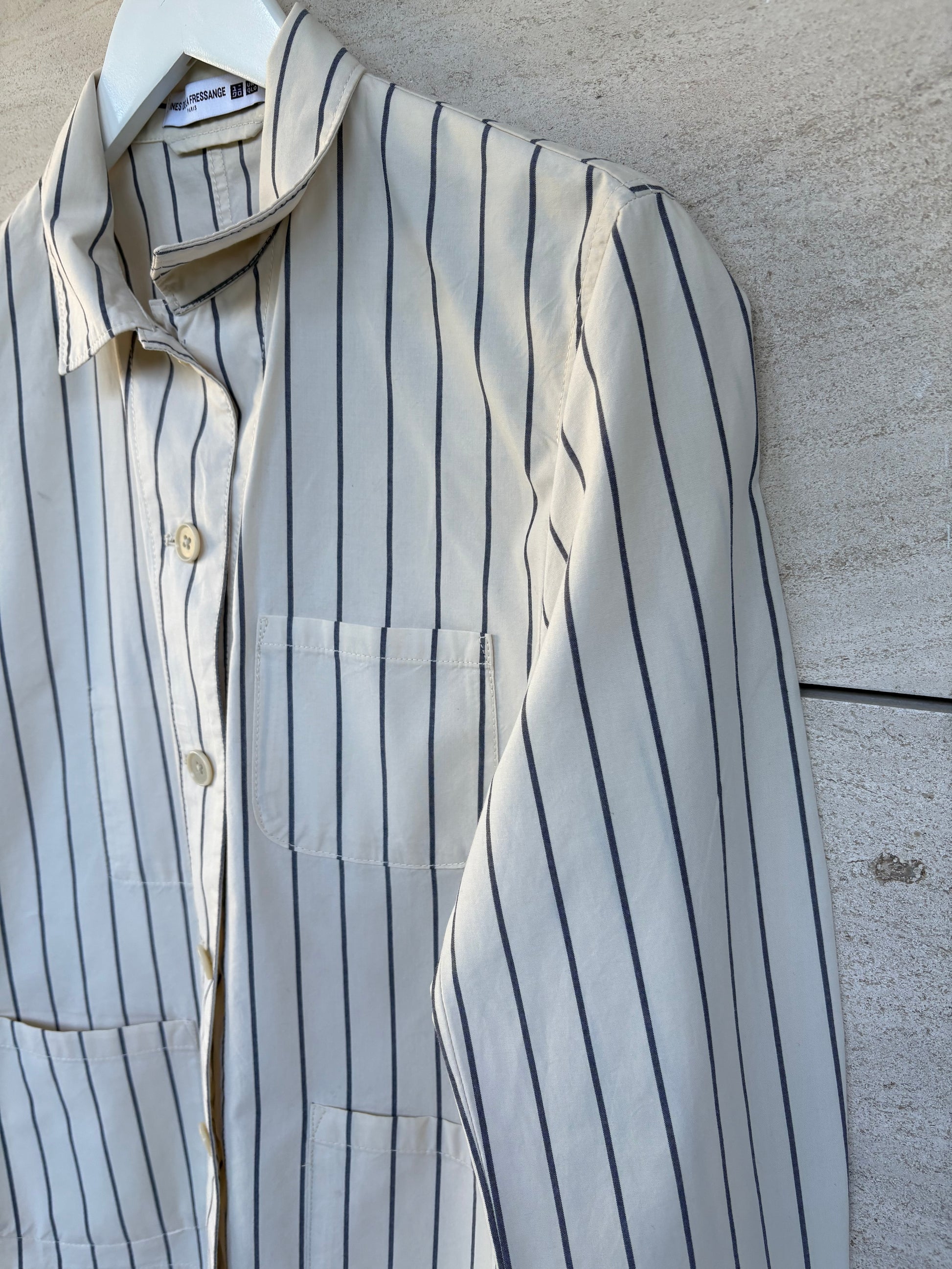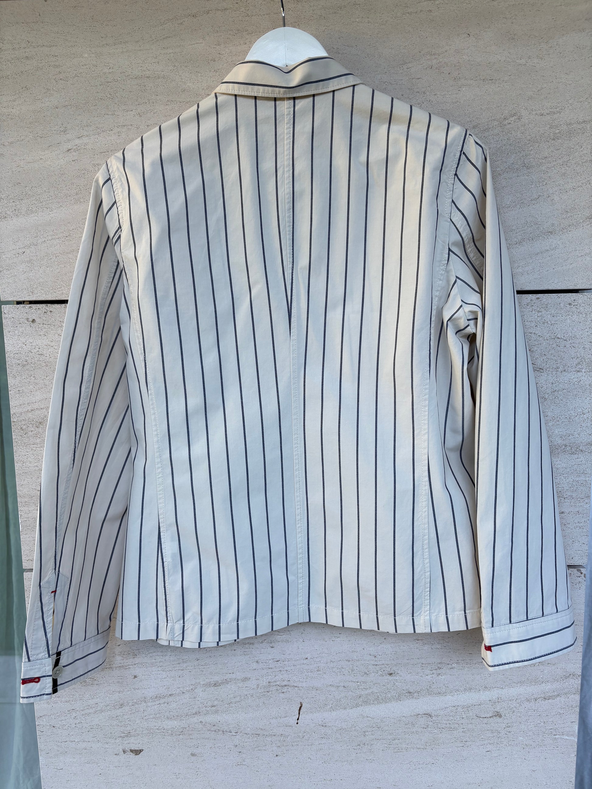 100% cotton. Back 52 cm, length 65 cm. Ecru background with blue stripes.