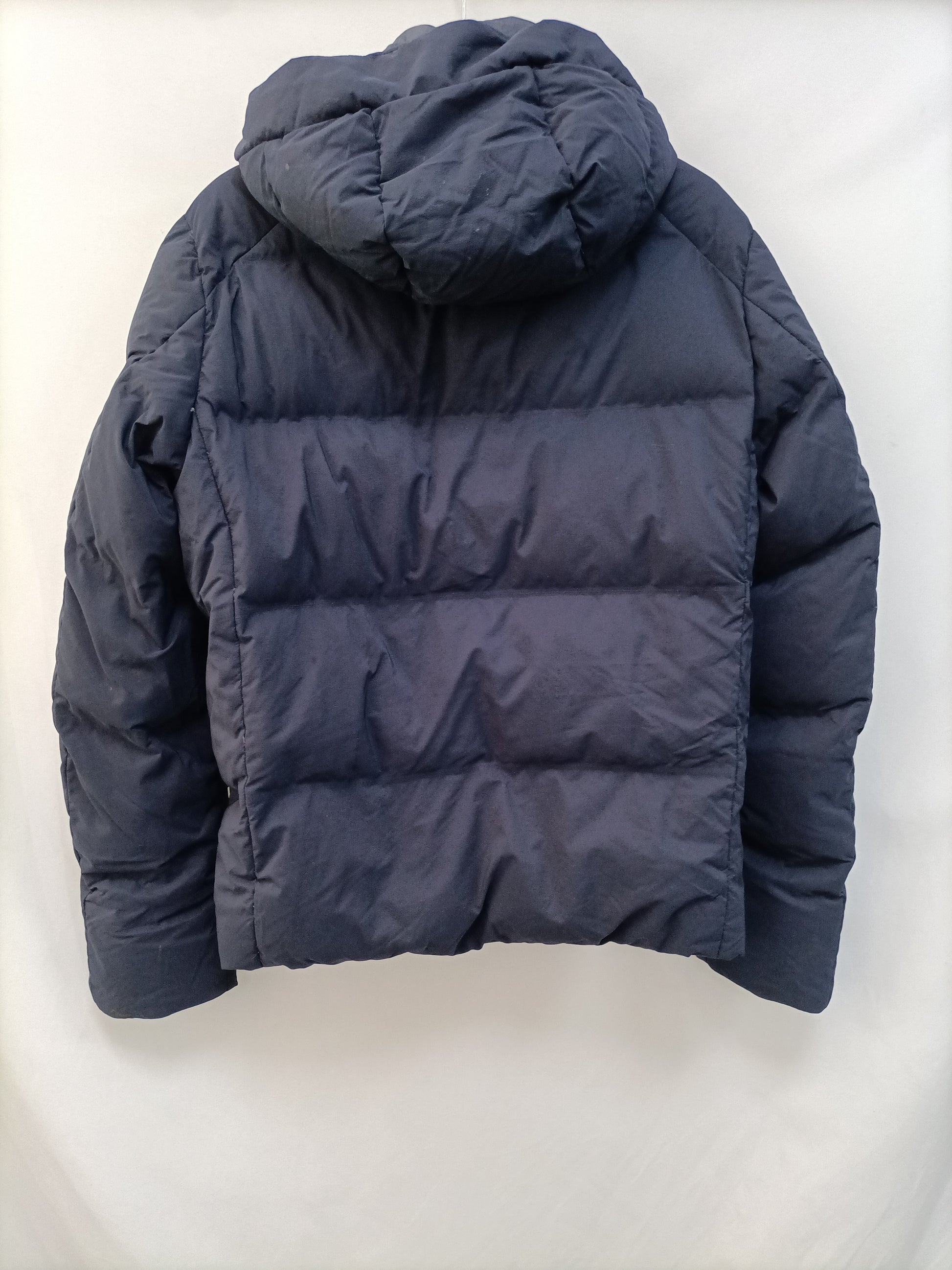 Blue quilted zip-up parka. Faux leather details on the pocket. 61 cm long.