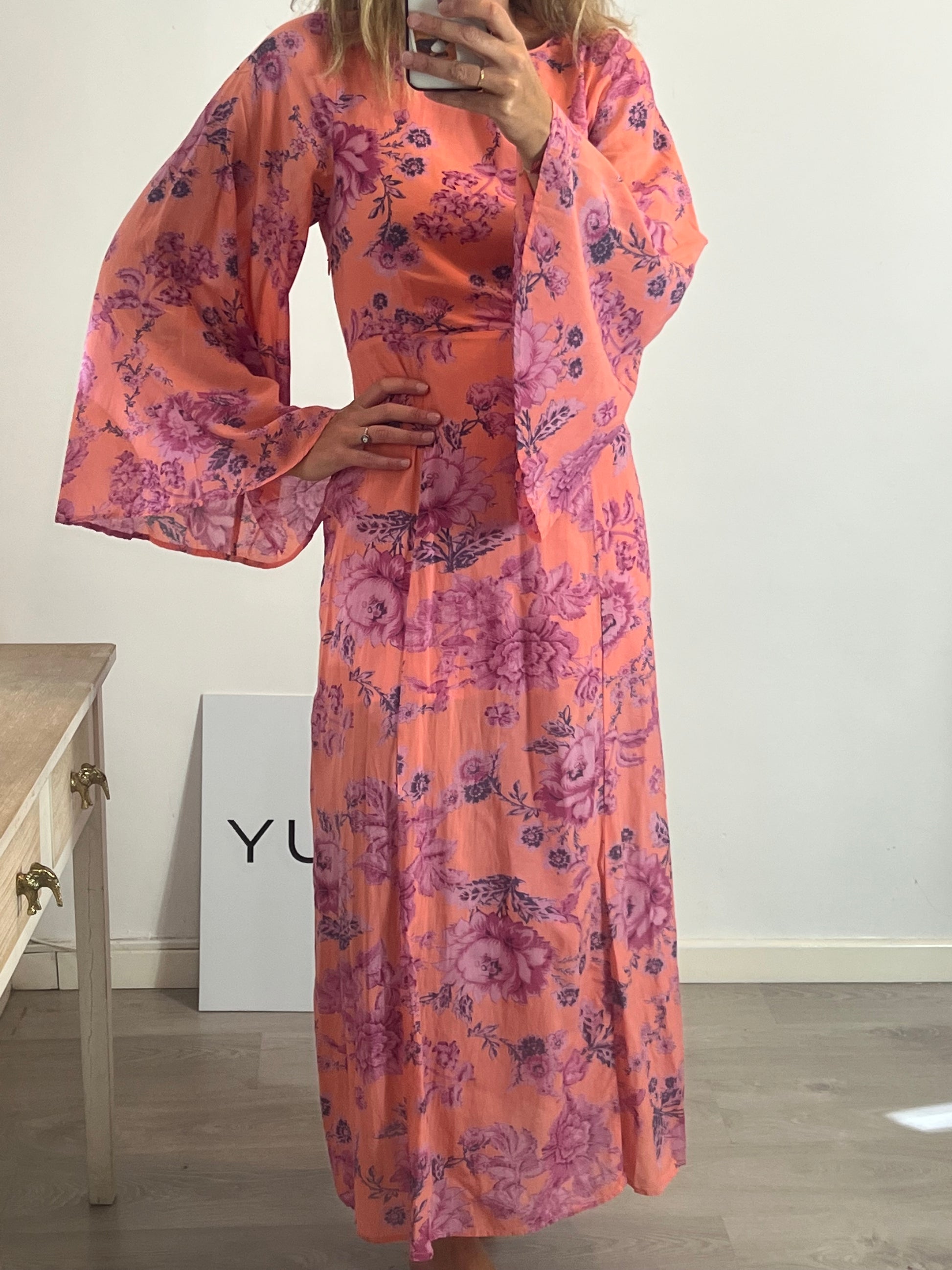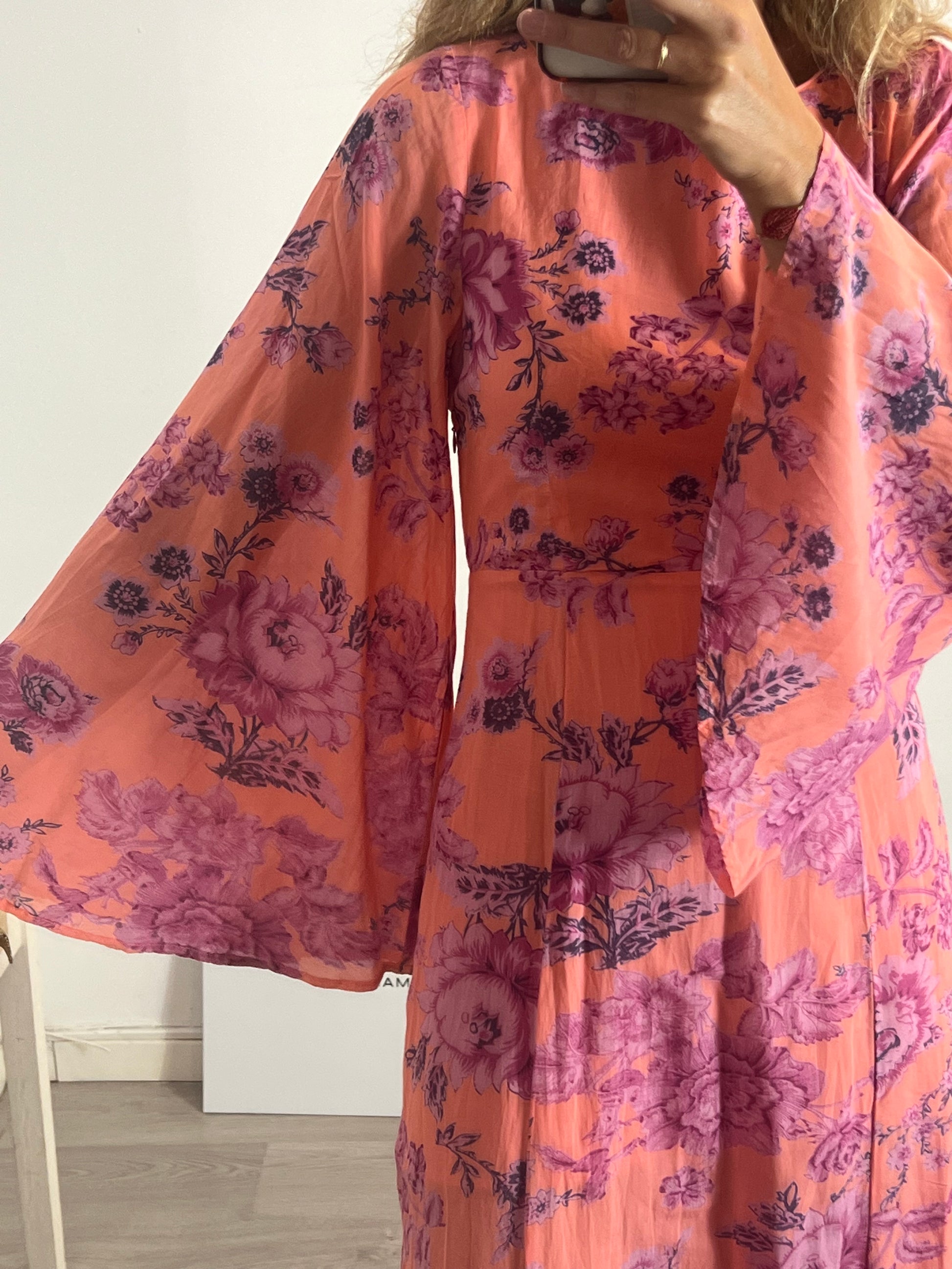Long orange dress with a floral print. Bell sleeves. From armhole to armhole 47 cm, waist 37 cm, length 137 cm.