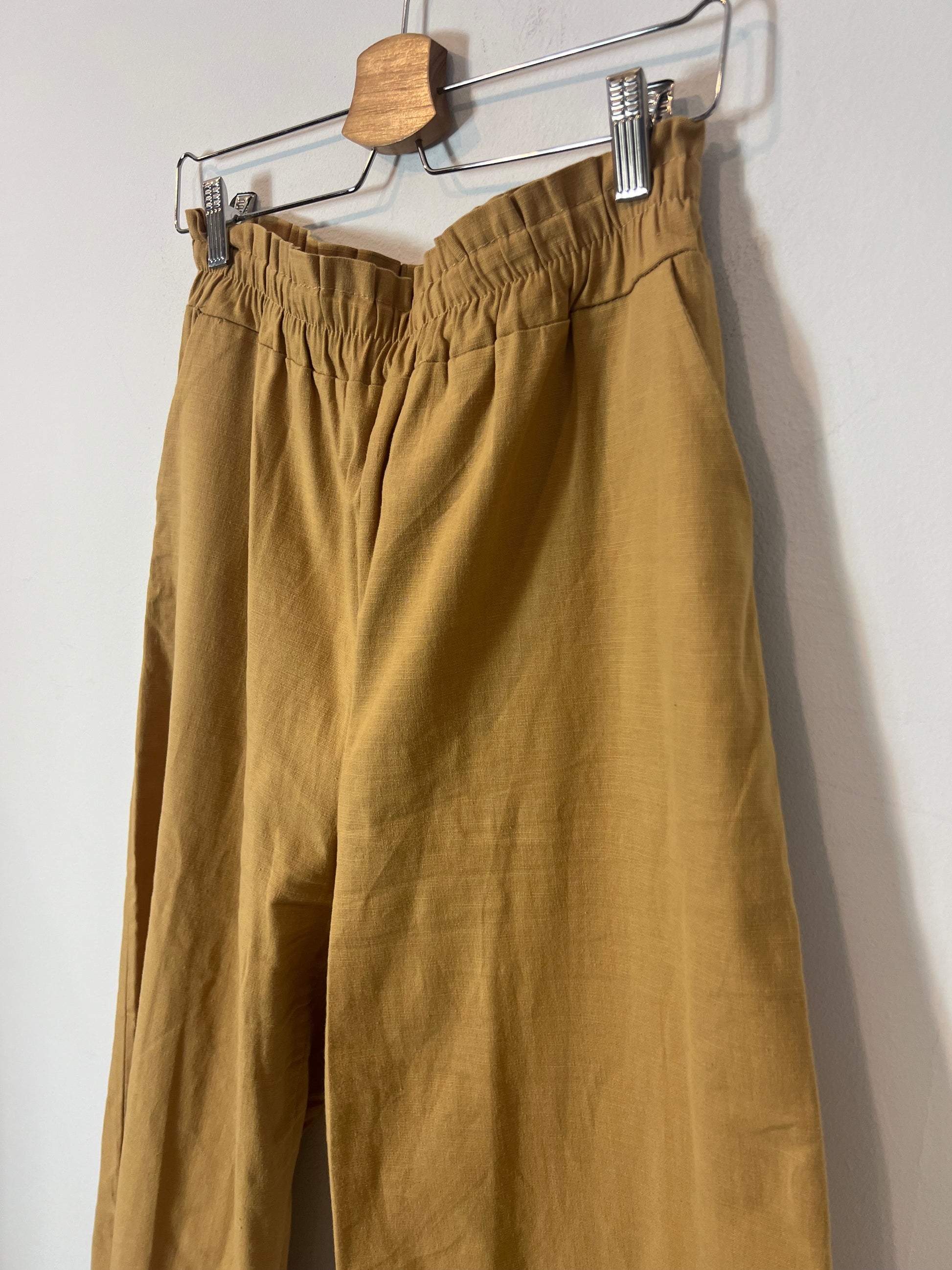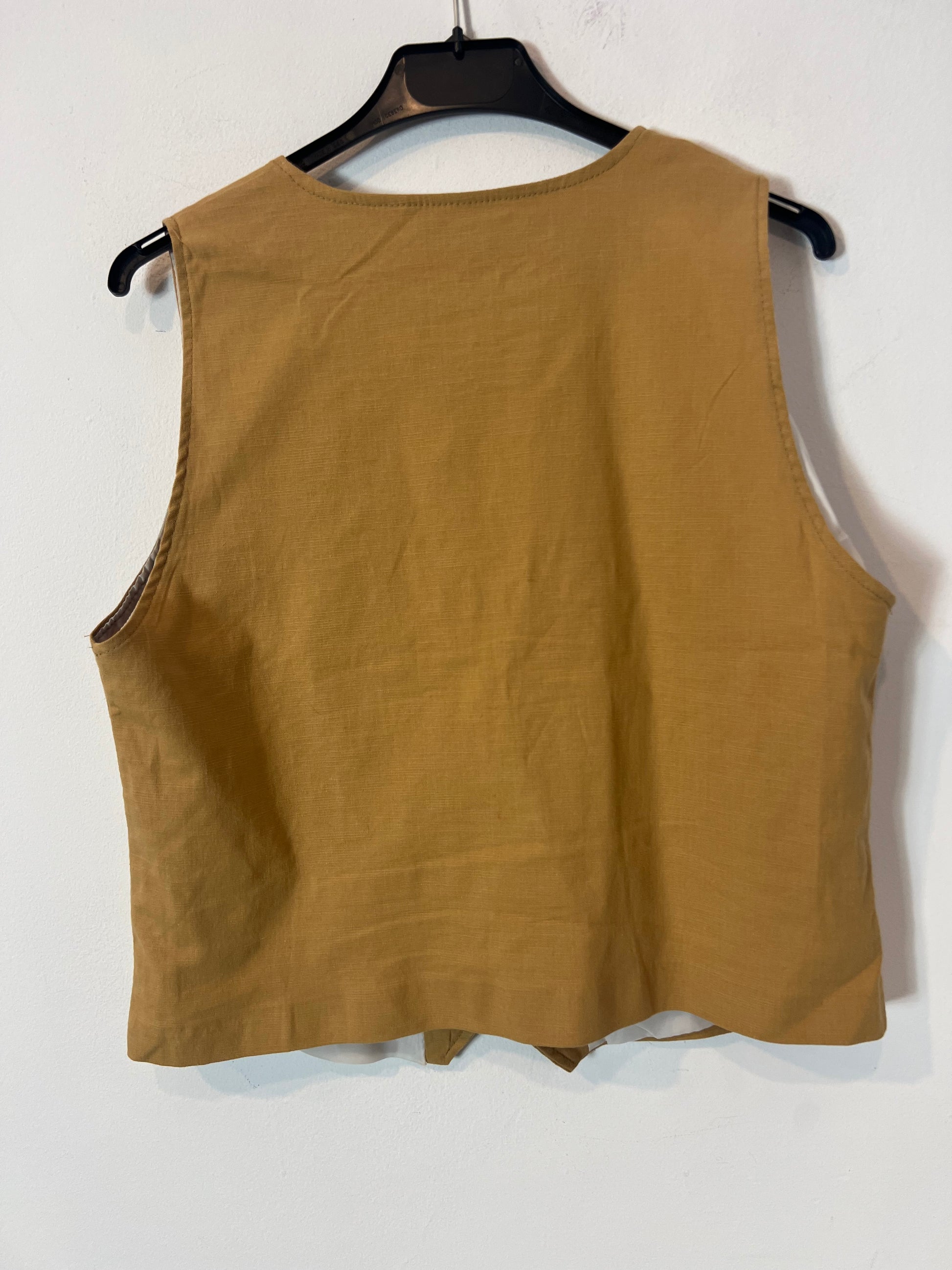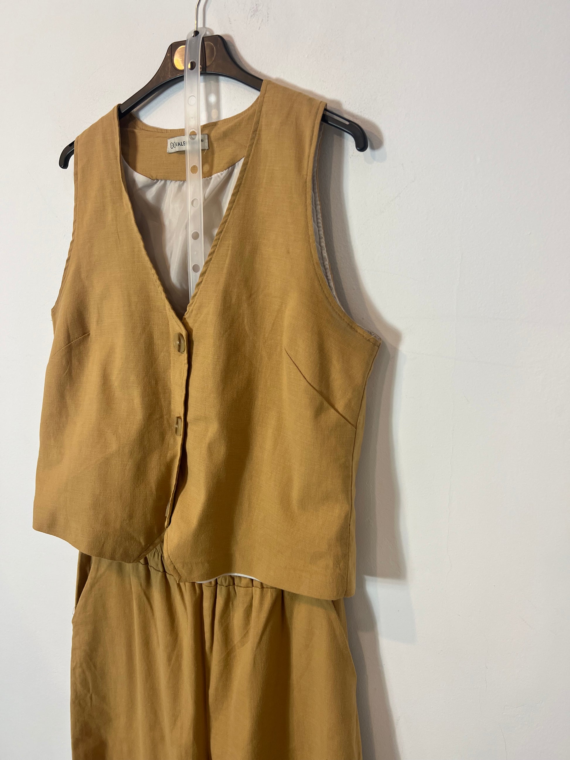 Mustard total look with flowing wide-legged trousers and a vest. 36 cm elastic waist, 92 cm long. Vest with a 49 cm back length, 46 cm back length.