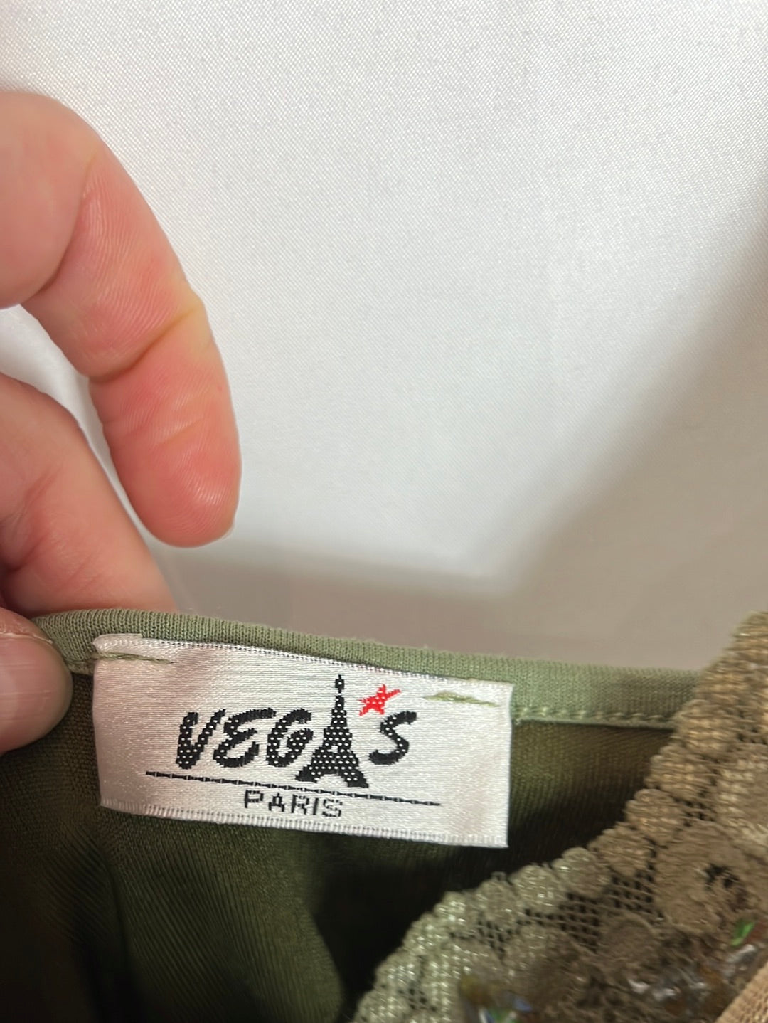 Stretch green printed tulle midi dress. Armpit to armpit 42cm, length 105cm (slightly longer). Semi-stretch.