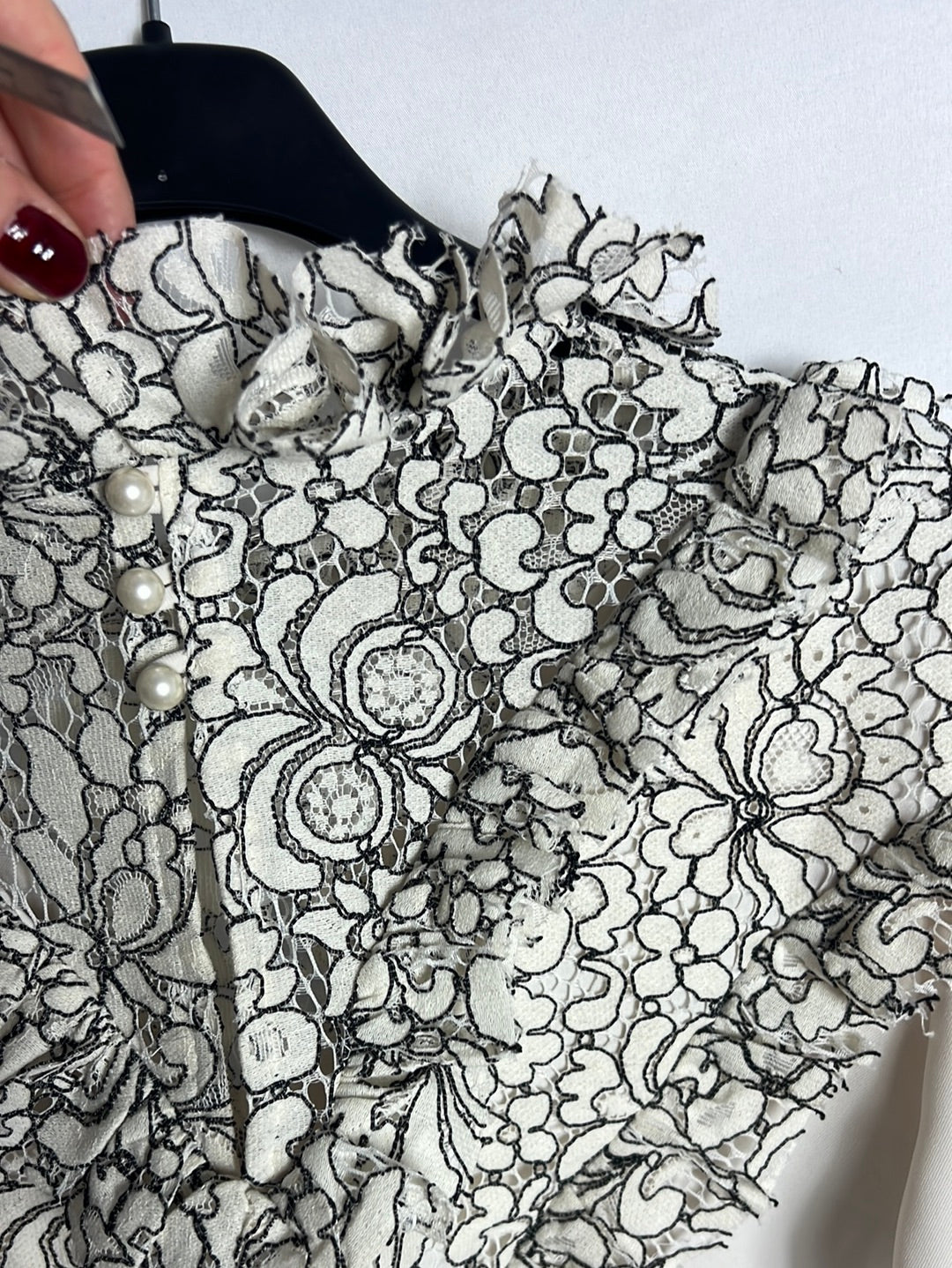 Flowy blouse with embroidered neckline and ruffle detail. 62cm long, armhole to armhole 44cm.