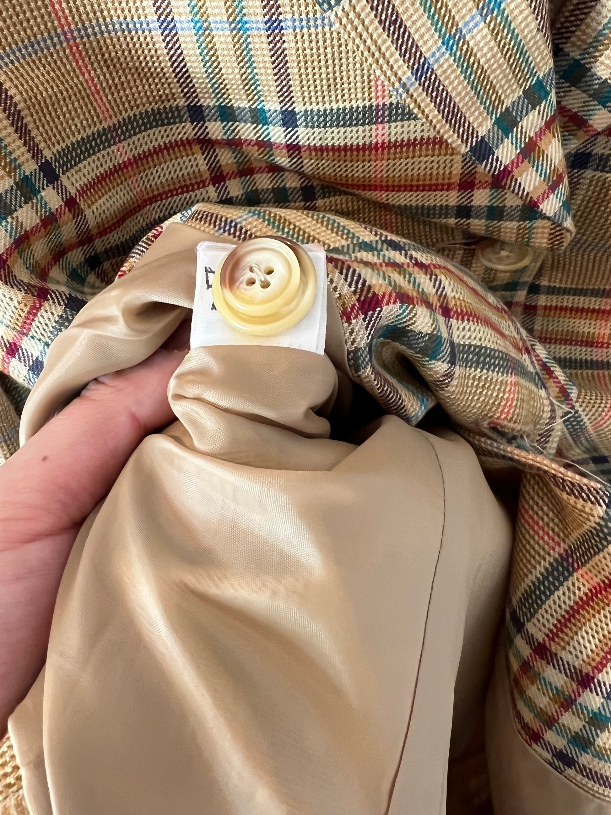 Blazer lino cuadros fondo en camel. Hombros 41cm, de sisa a sisa 47cm, largo 67cm