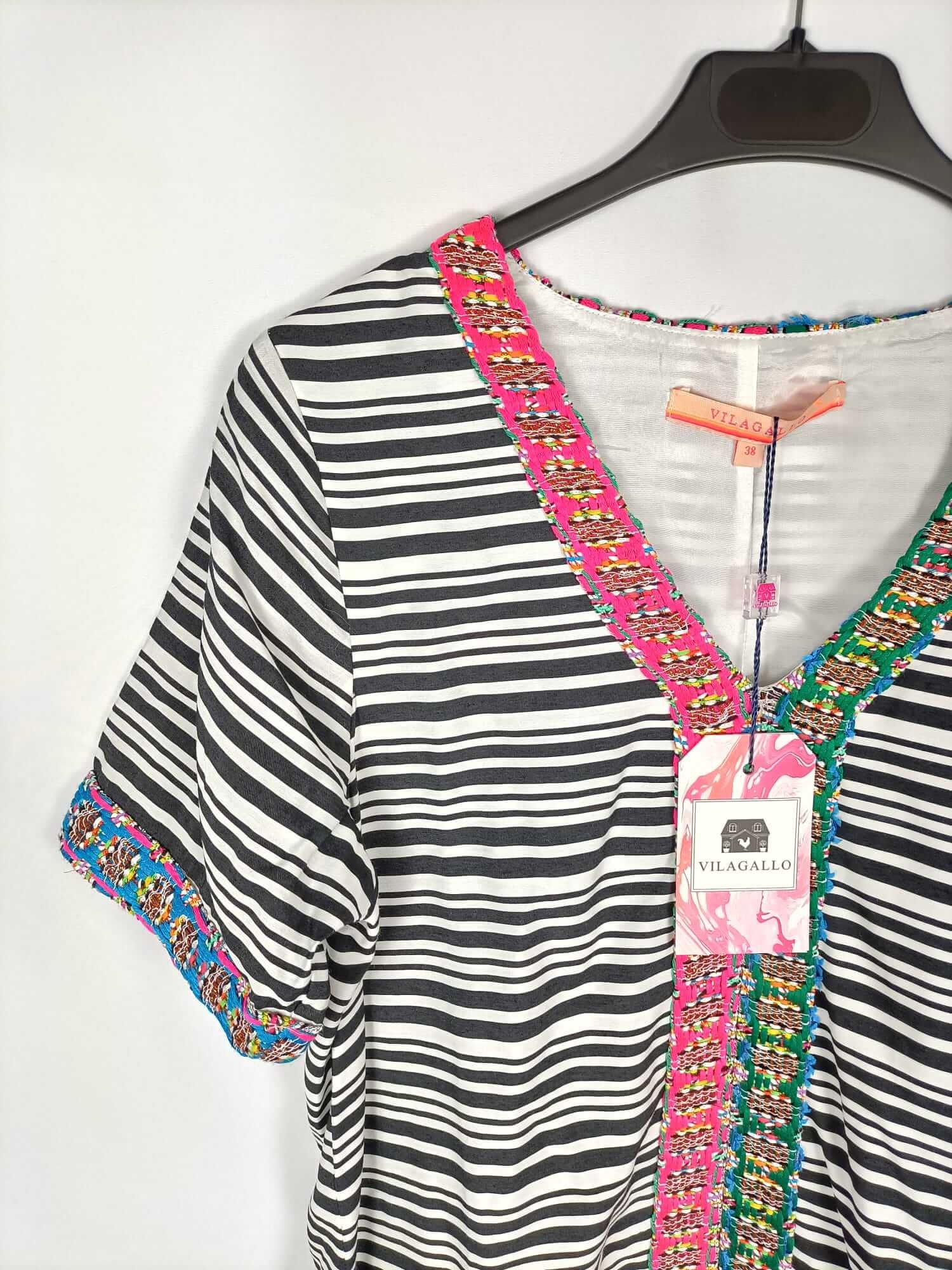 VILA GALLO. NUEVO CON ETIQUETA. Vestido de rayas negro y blanco con detalle bordados étnico en la parte delantera y mangas. No elástico. De sisa a sisa 46 cm largo 86 cm q
