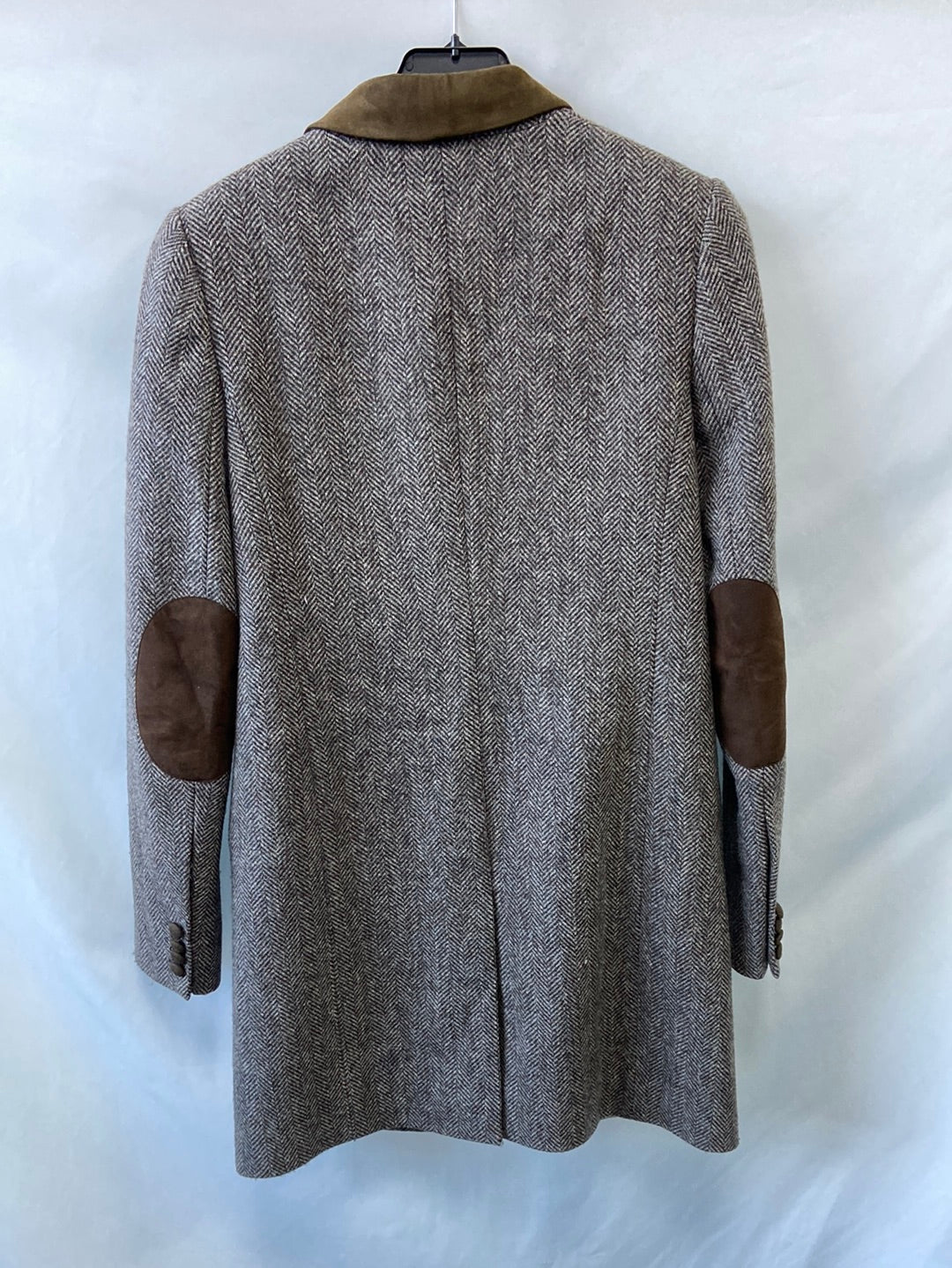 Long brown herringbone blazer with suede collar and elbow patches. 44 cm from armpit to armpit, 80 cm long.