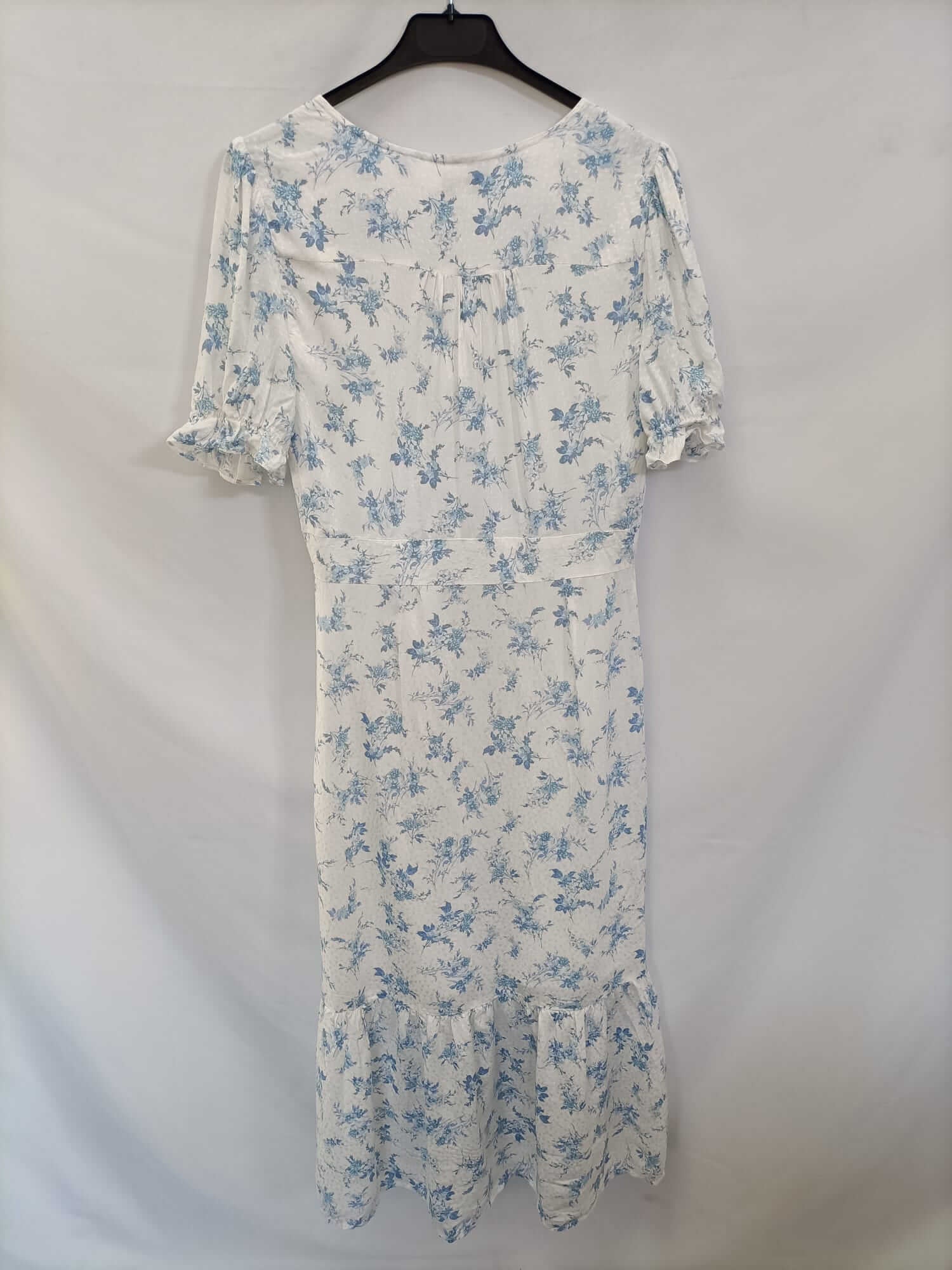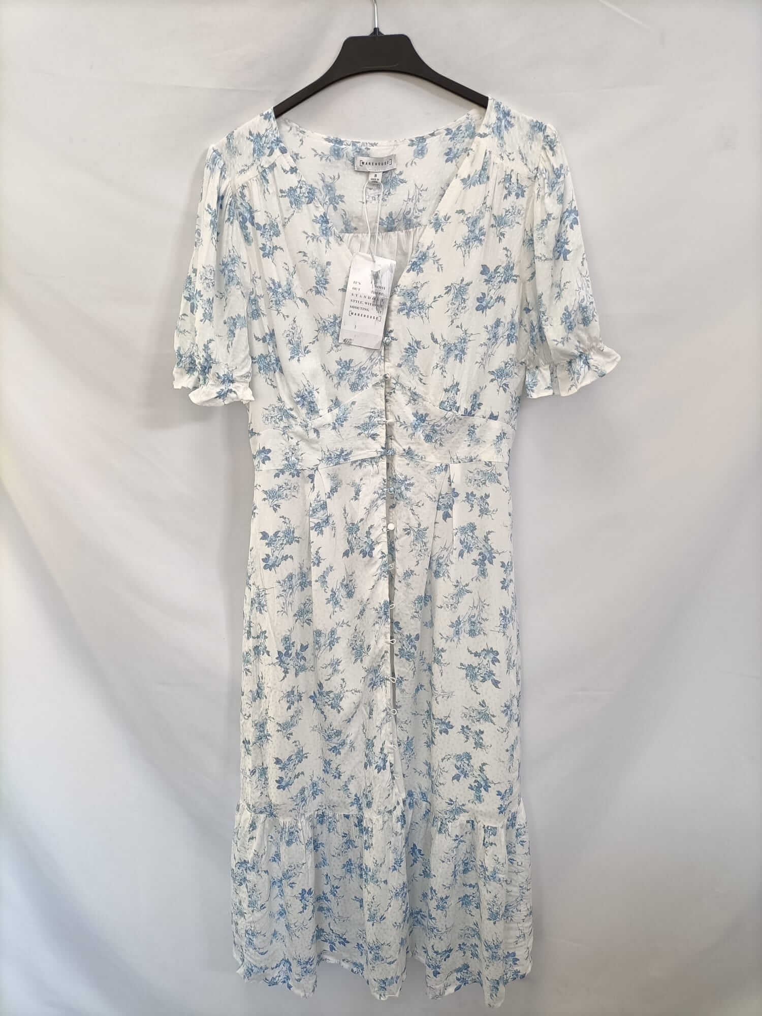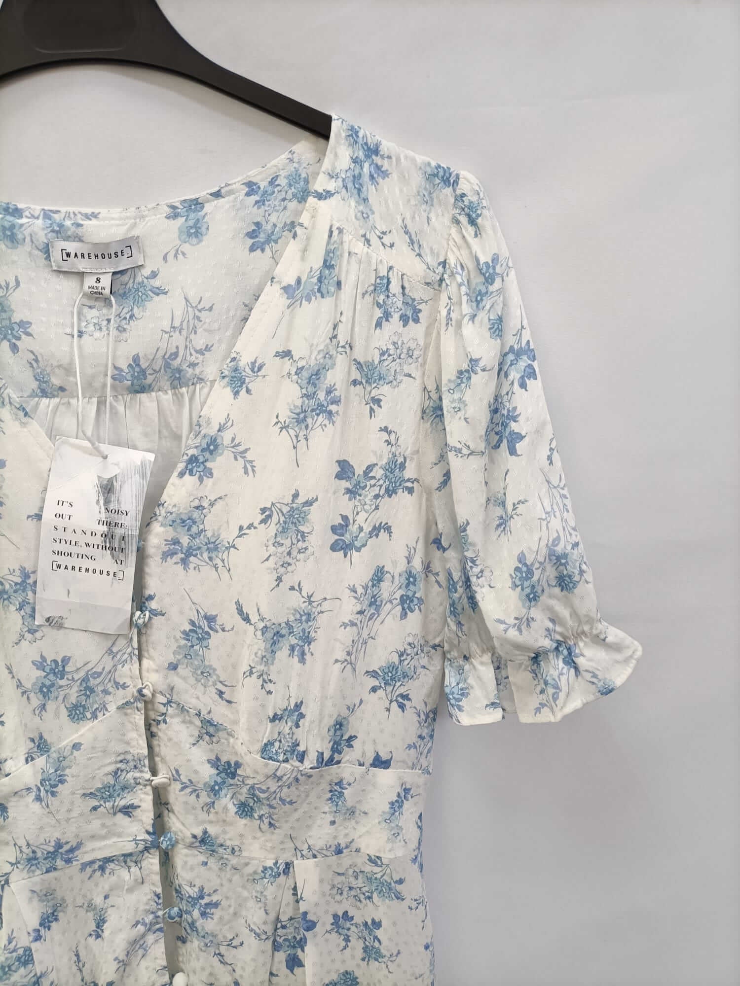 Warehouse. 36. NEW WITH TAG. White ankle-length dress with blue flowers. Button-up. Flowy. No stretch. Armhole to armhole 44 cm, length 122 cm. €56