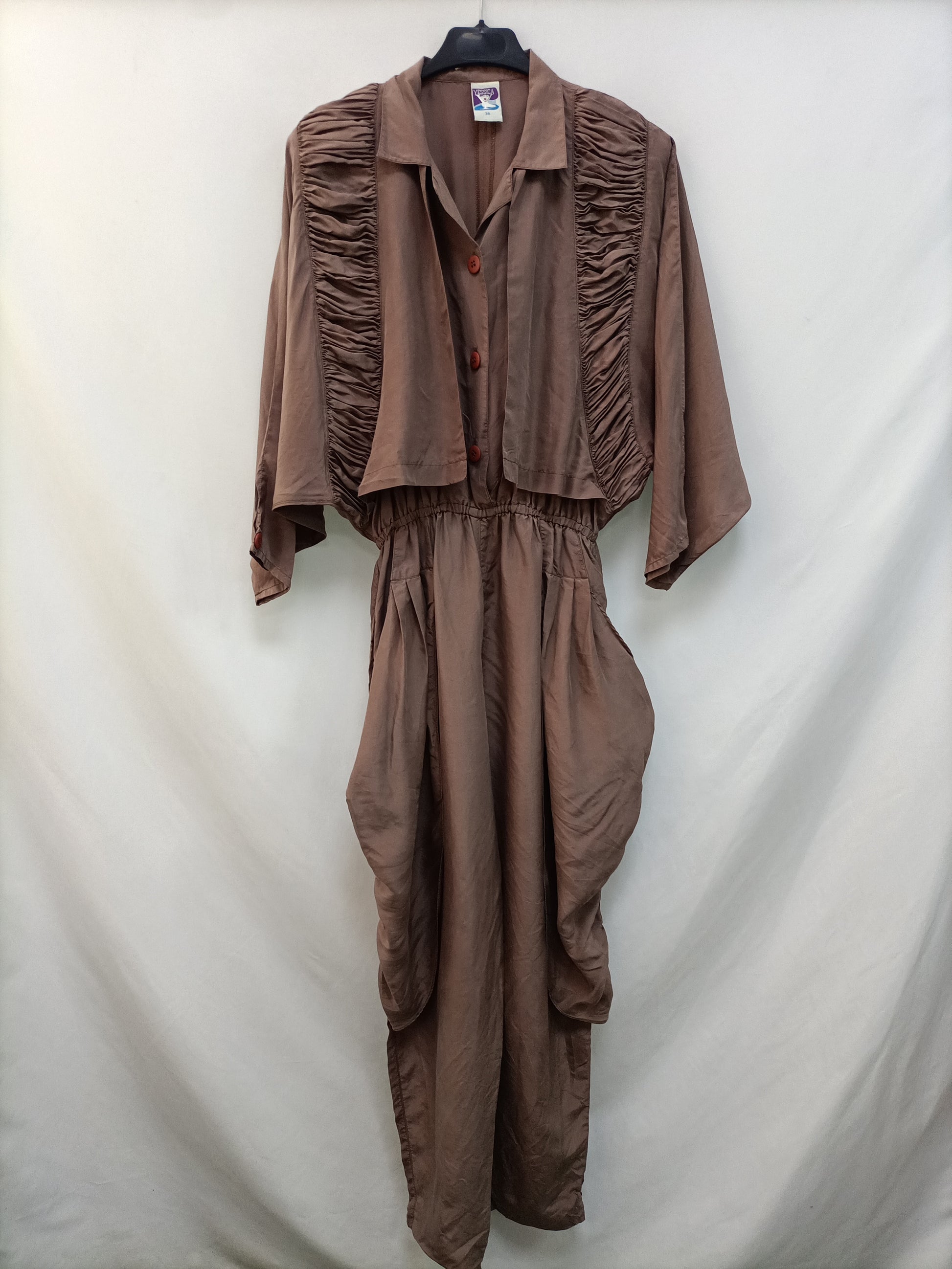 Mono largo marrón con la parte de arriba abotonada y laterales con volantes. Largo 140 cm