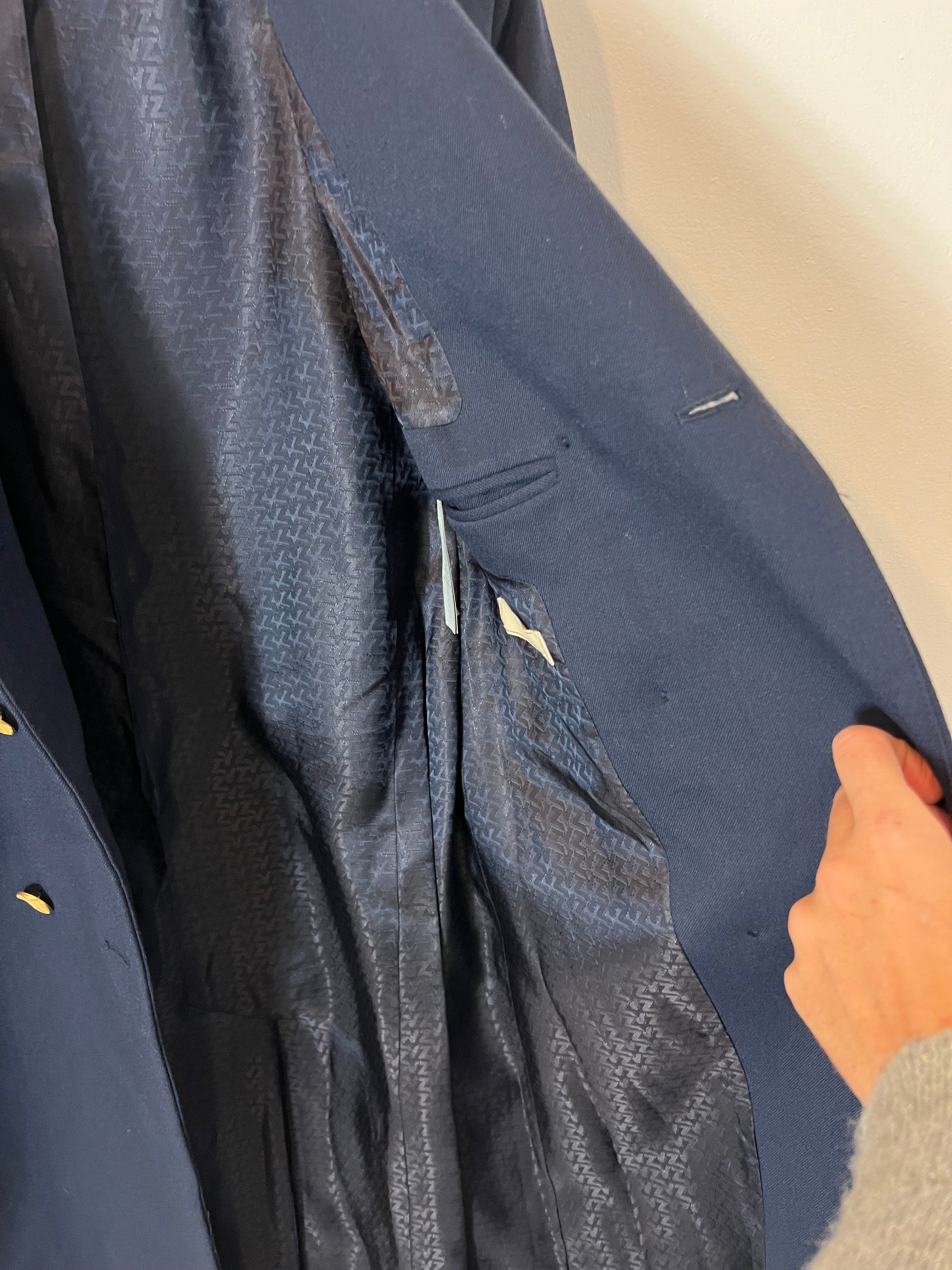 Long blue wool coat with gold buttons, shoulders 40cm, from armpit to armpit 47cm, length 110cm