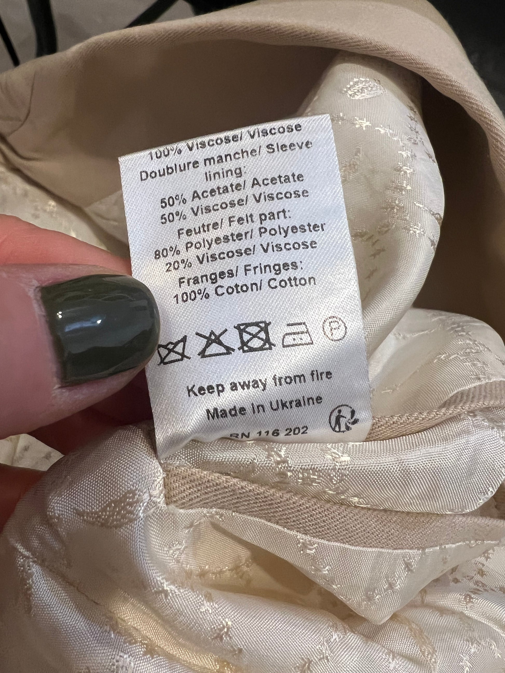 Beige blazer with fringe detailing on the sleeves. Shoulders 37cm, armhole to armhole 45cm, length 63cm