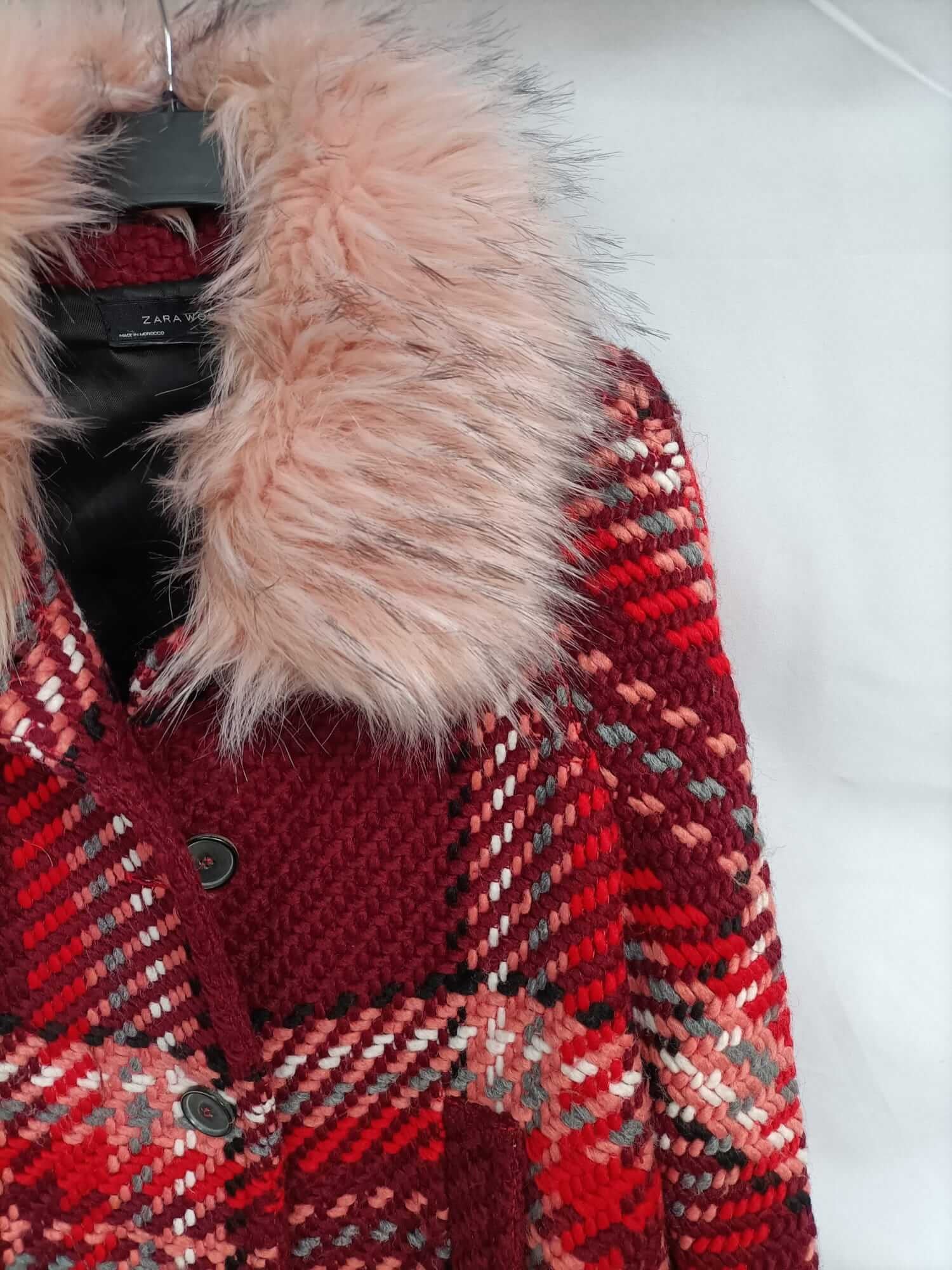 Zara. 11. Checked coat in all reds and burgundy with a detachable fur collar. Buttoned. No stretch. Armpit to armpit 53 cm, length 87 cm.