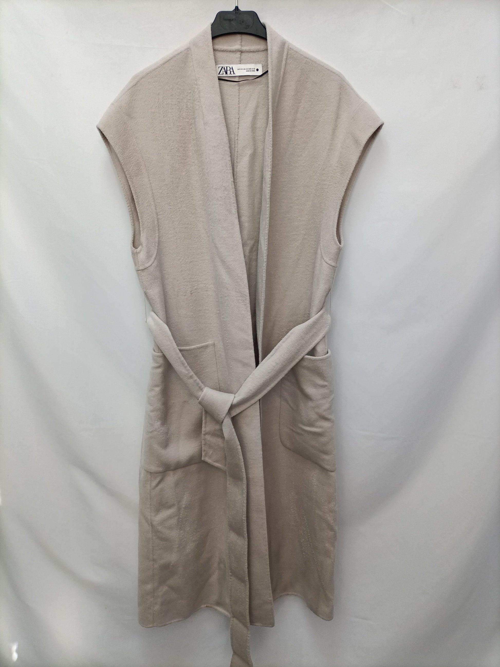 Beige sleeveless cloth coat. Soft and cozy. With a lace fastening. 50 cm from armhole to armhole. 123 cm long.