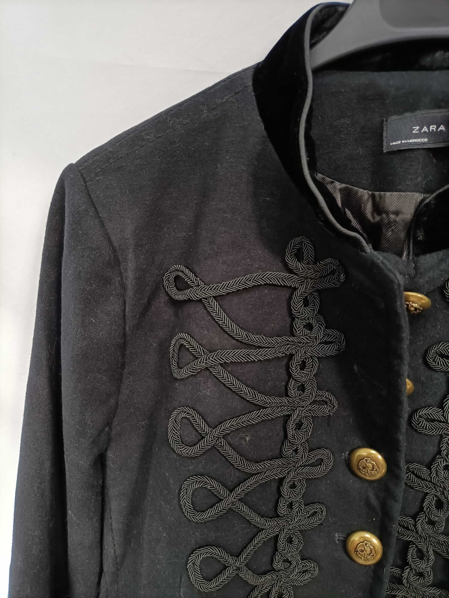 Zara. XL. Black cloth coat with gold buttons and military-style knots. Non-stretchy. Armpit to armpit 52 cm, length 77 cm.