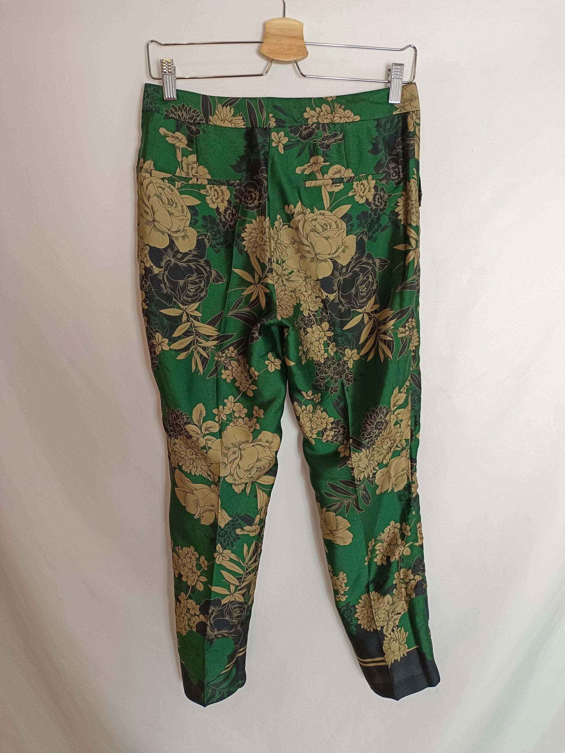 A fluid and fine green blazer with black and gold flowers. Total look with trousers.