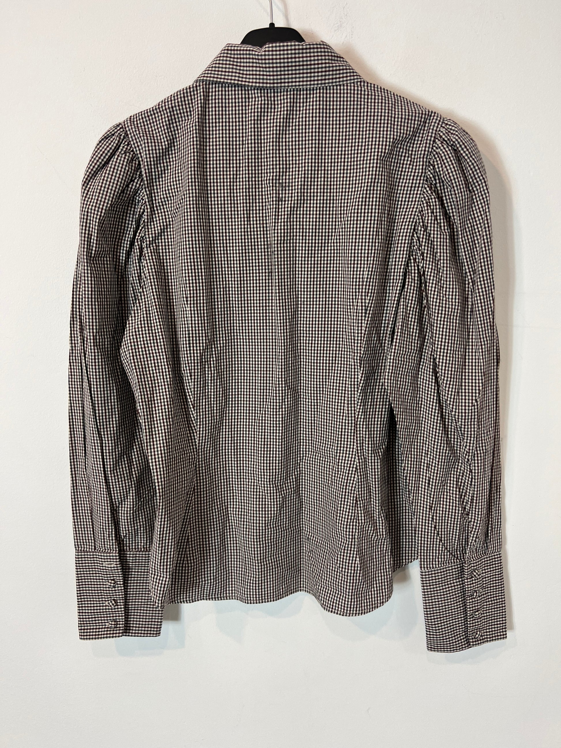 blusa de cuadros verde y burdeos. Entallada con detalle de hombros fruncidos. tara: botón roto