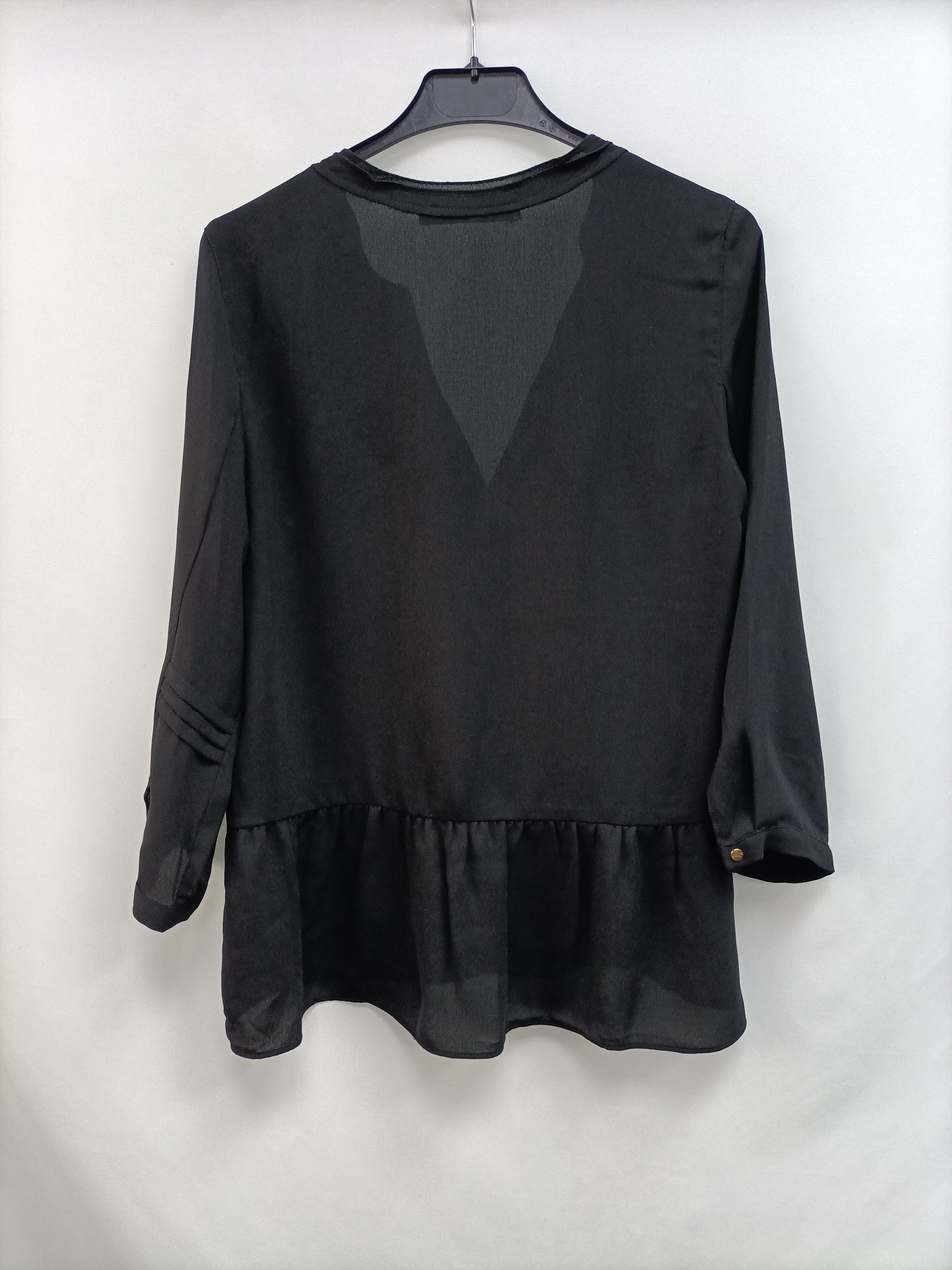 Blusa negra fluida volante en la espalda. De sisa a sisa 47 cm Largo 64 cm.