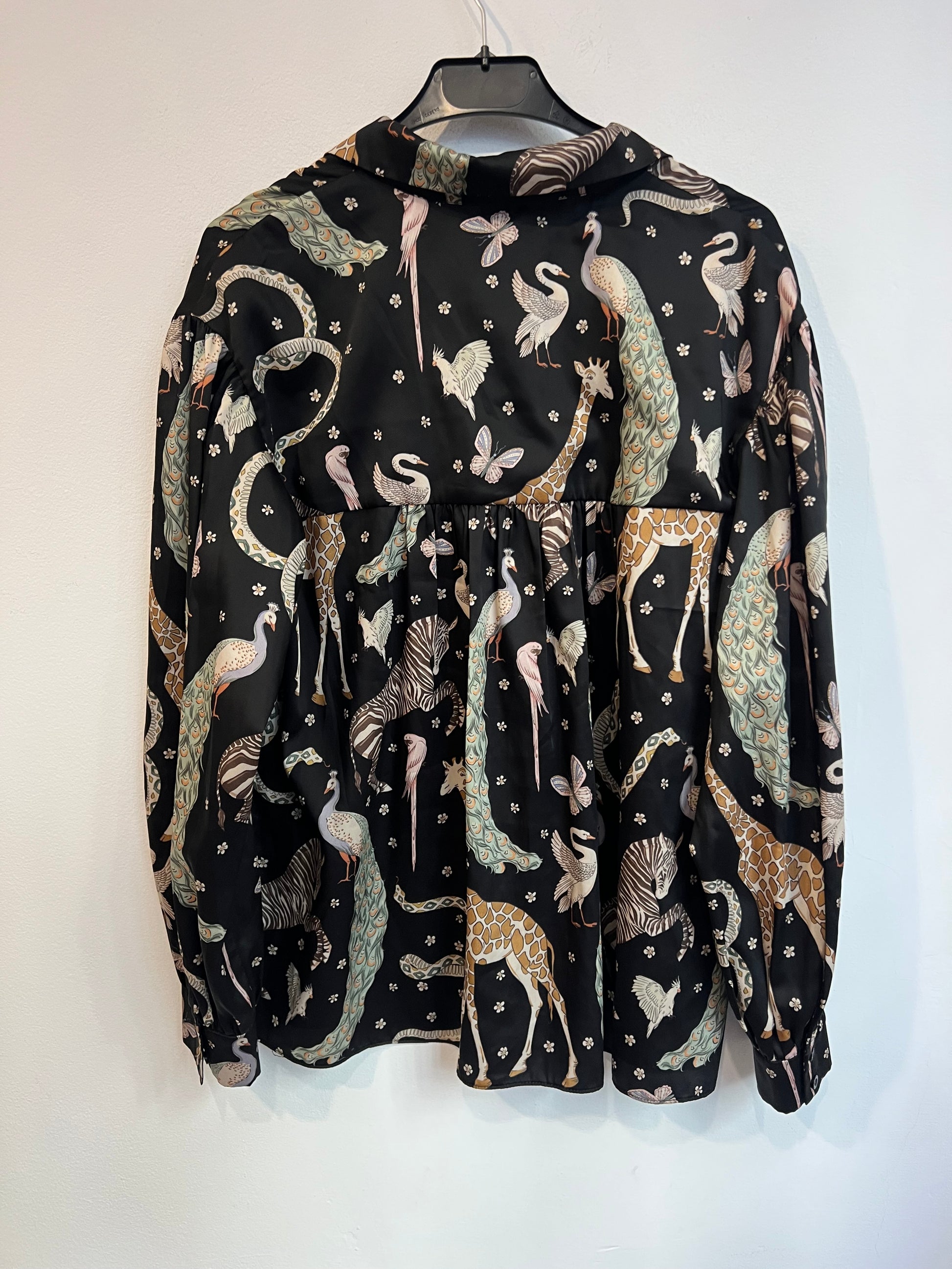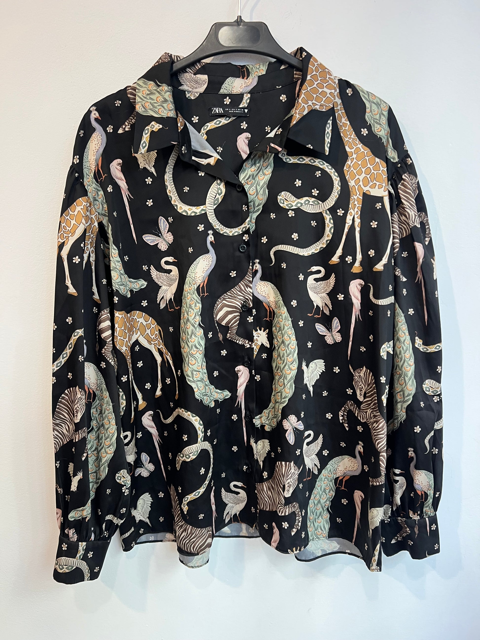 Size M. Black satin animal print blouse. 50 cm from armpit to armpit, 64 cm long.