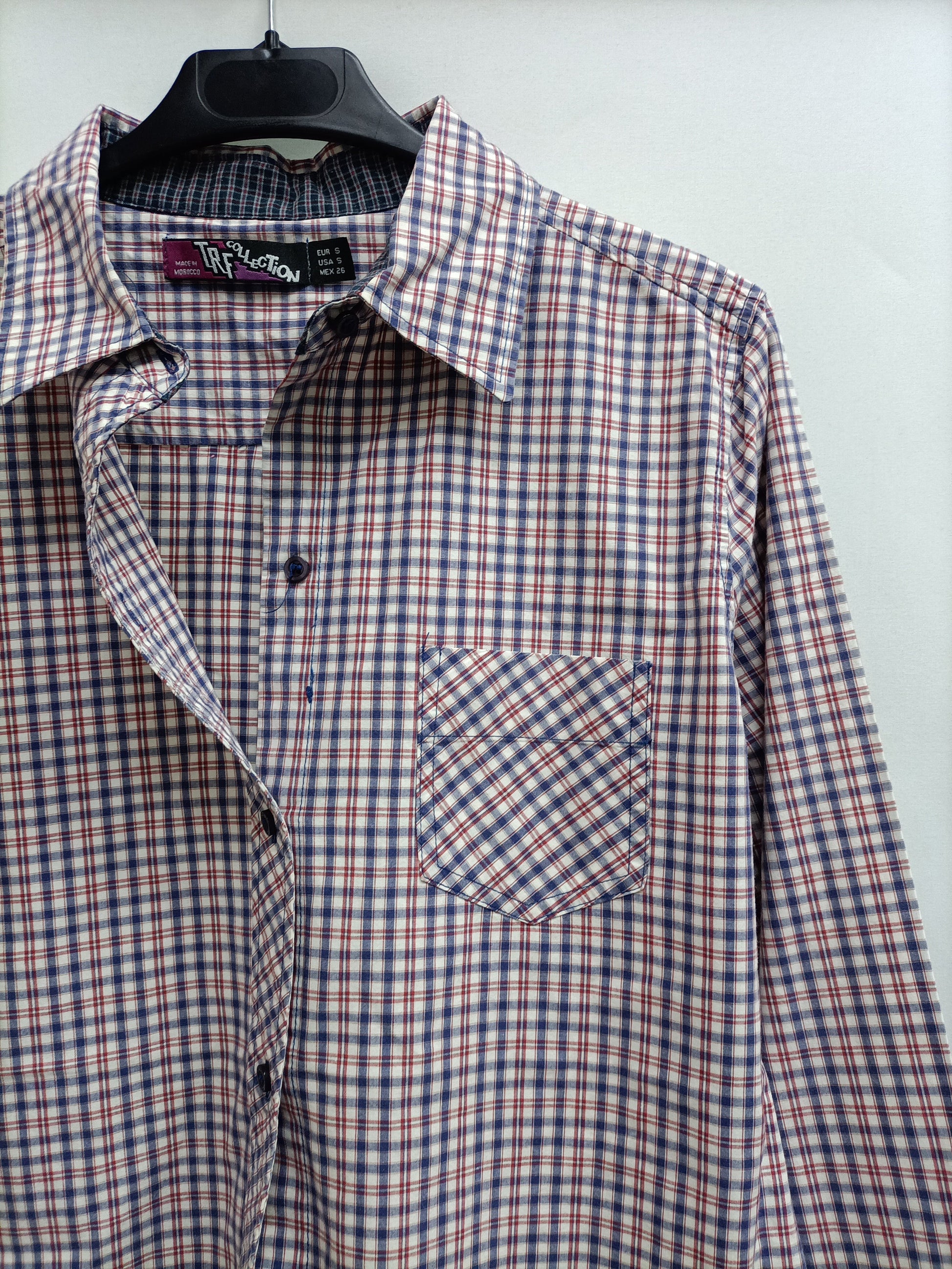 White shirt with red and purple squares. From armpit to armpit 50 cm, length 67 cm.