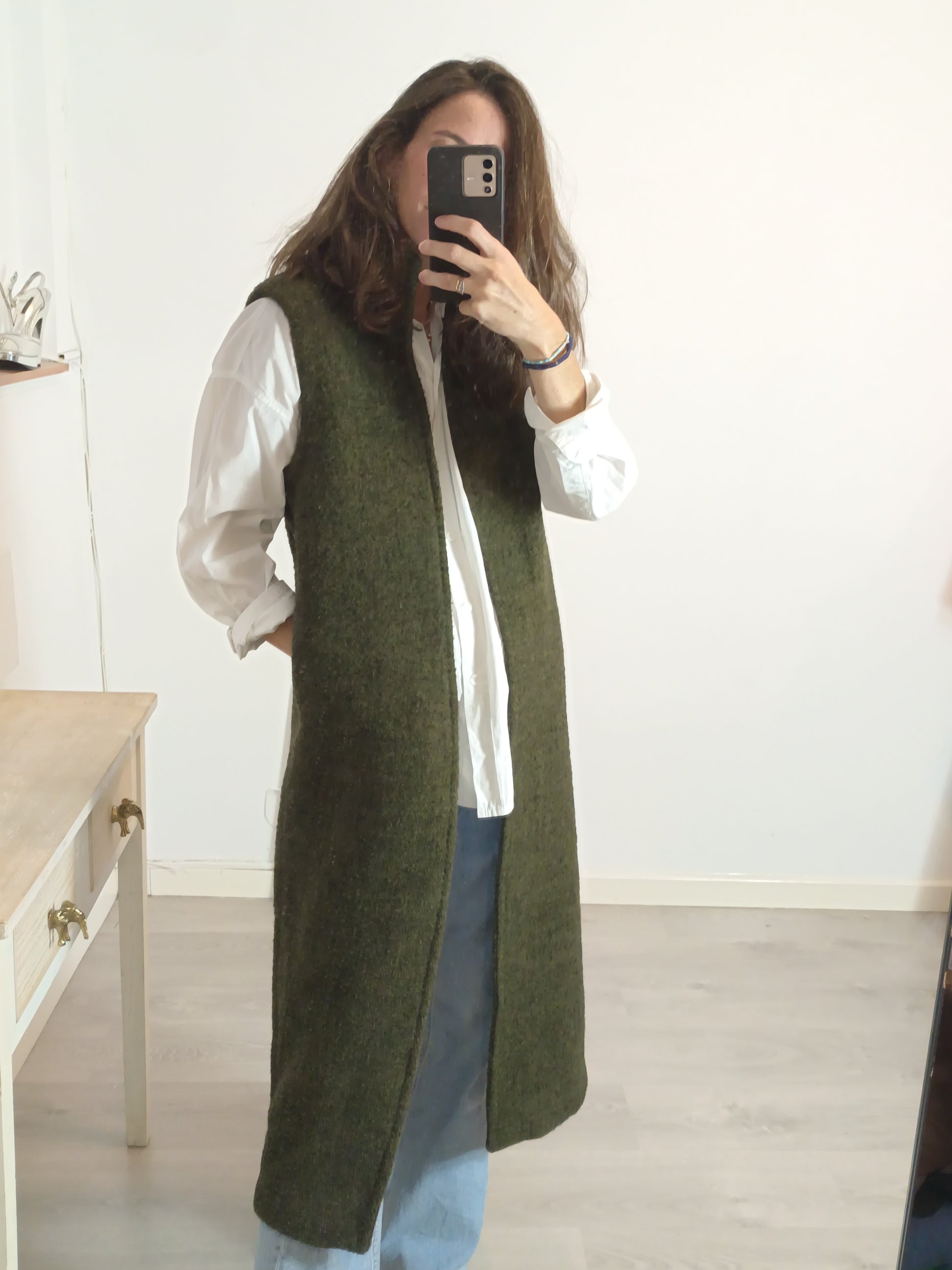 NEW WITH TAG. Heathered green wool vest. Back 47cm, length 114cm