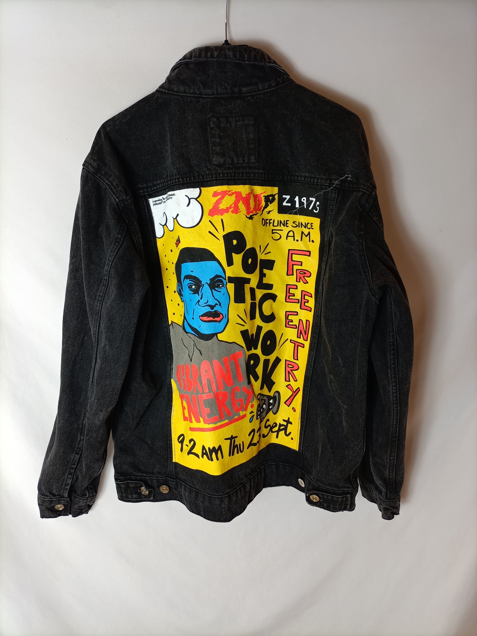 Oversized denim jacket with a distressed black design on the back.