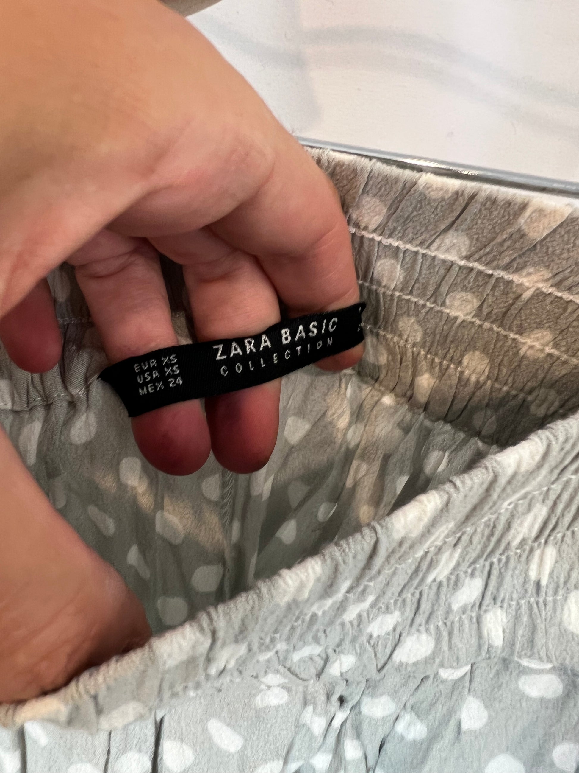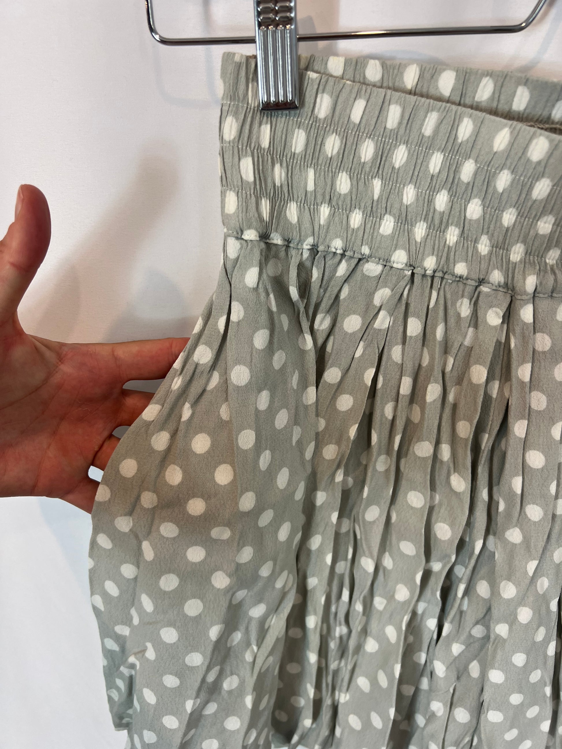 Short flared skirt with light gray polka dots. Elastic waist. 44 cm long.