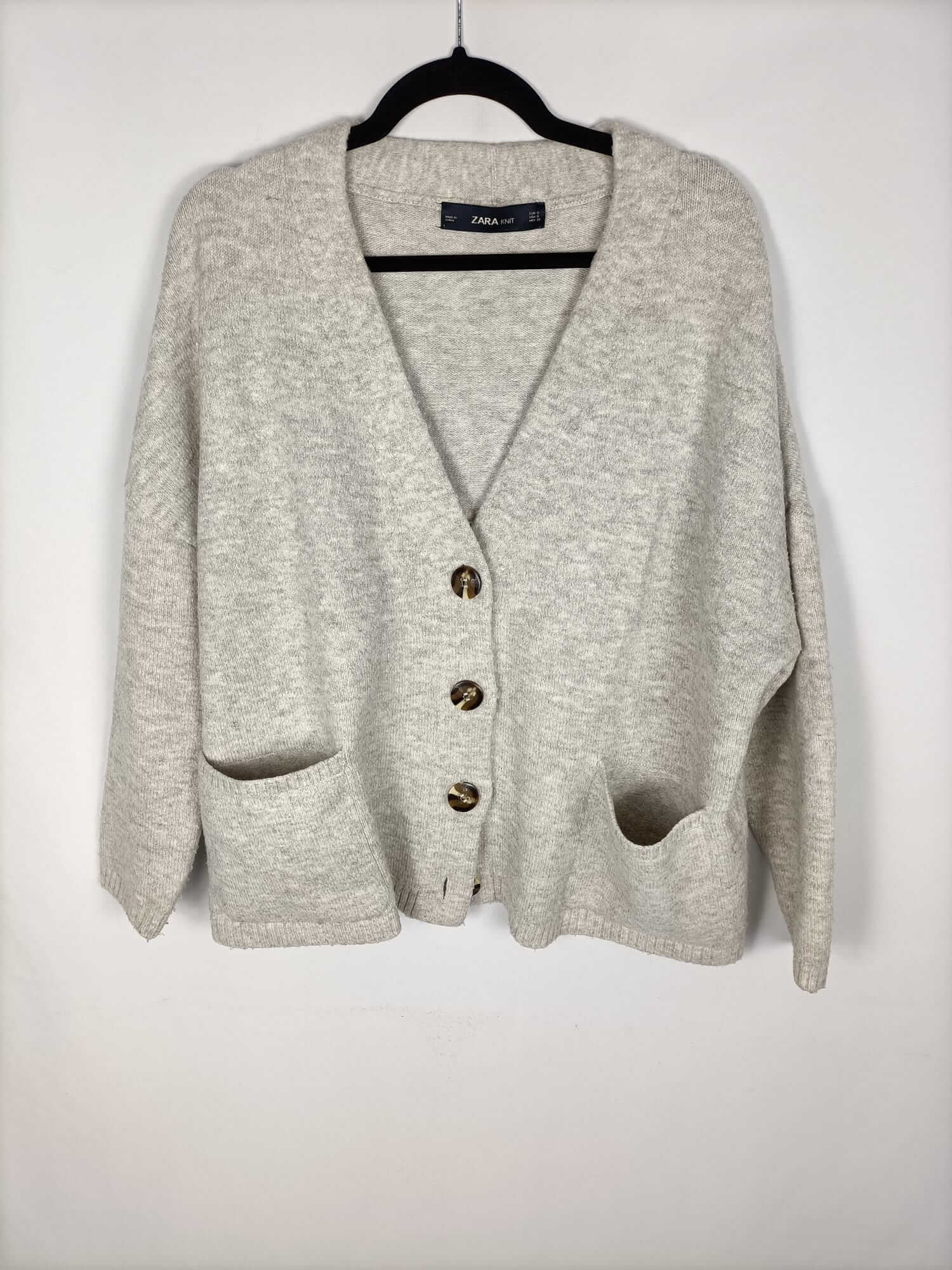 Zara. Mottled beige knit cardigan with buttons. Mother-of-pearl. Stretchy and oversized. Length 65 cm.