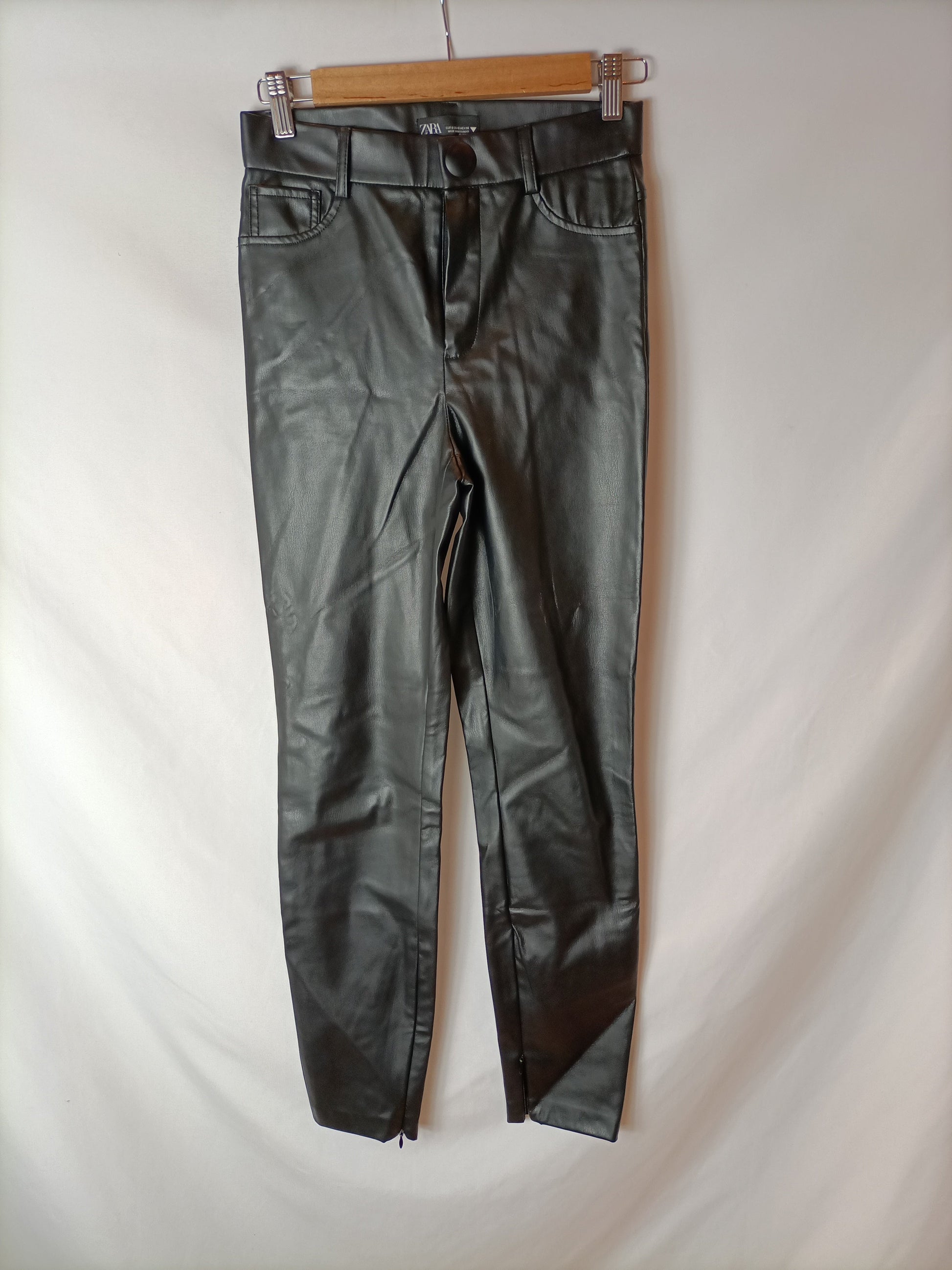 Black faux leather trousers with ankle zippers on the inside. Waist: 34 cm, length: 98 cm.
