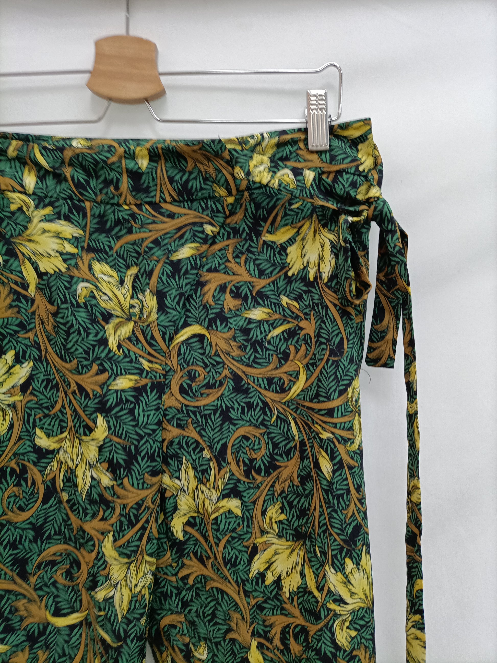 Zara. Flowy printed trousers with a crossover waist and tie. Thin and lightweight. Non-stretchy. Waist 40 cm, length 90 cm.