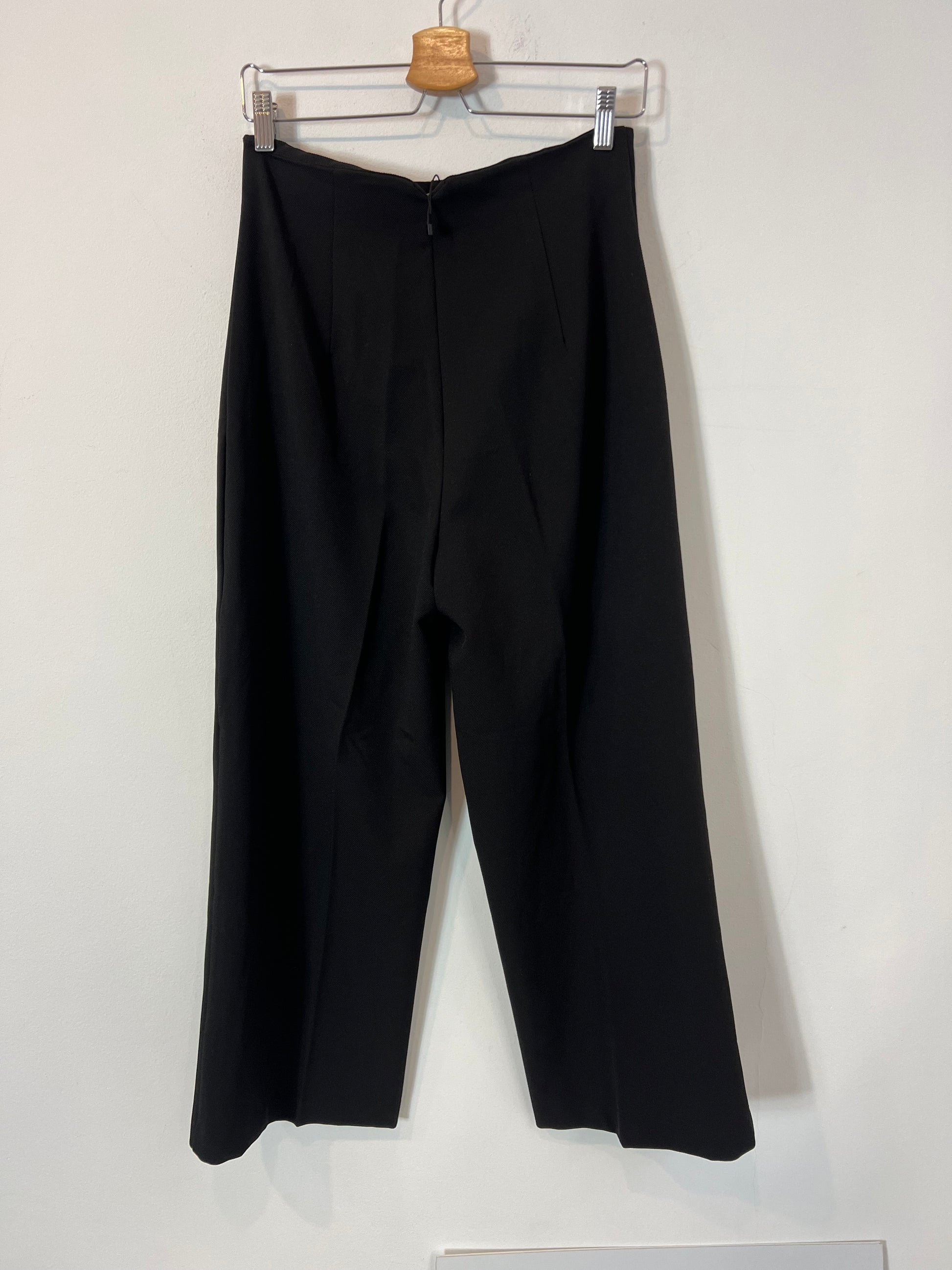 Black, wide-legged, flowy dress pants. Non-stretch. Waist 15.5 in., length 38 in.