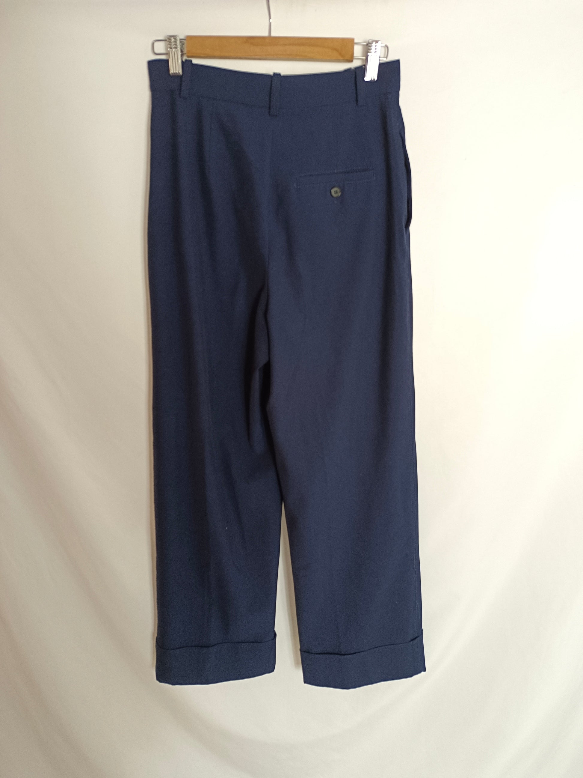 Blue, pleated, non-stretchy, fluid trousers. Total look with a vest.