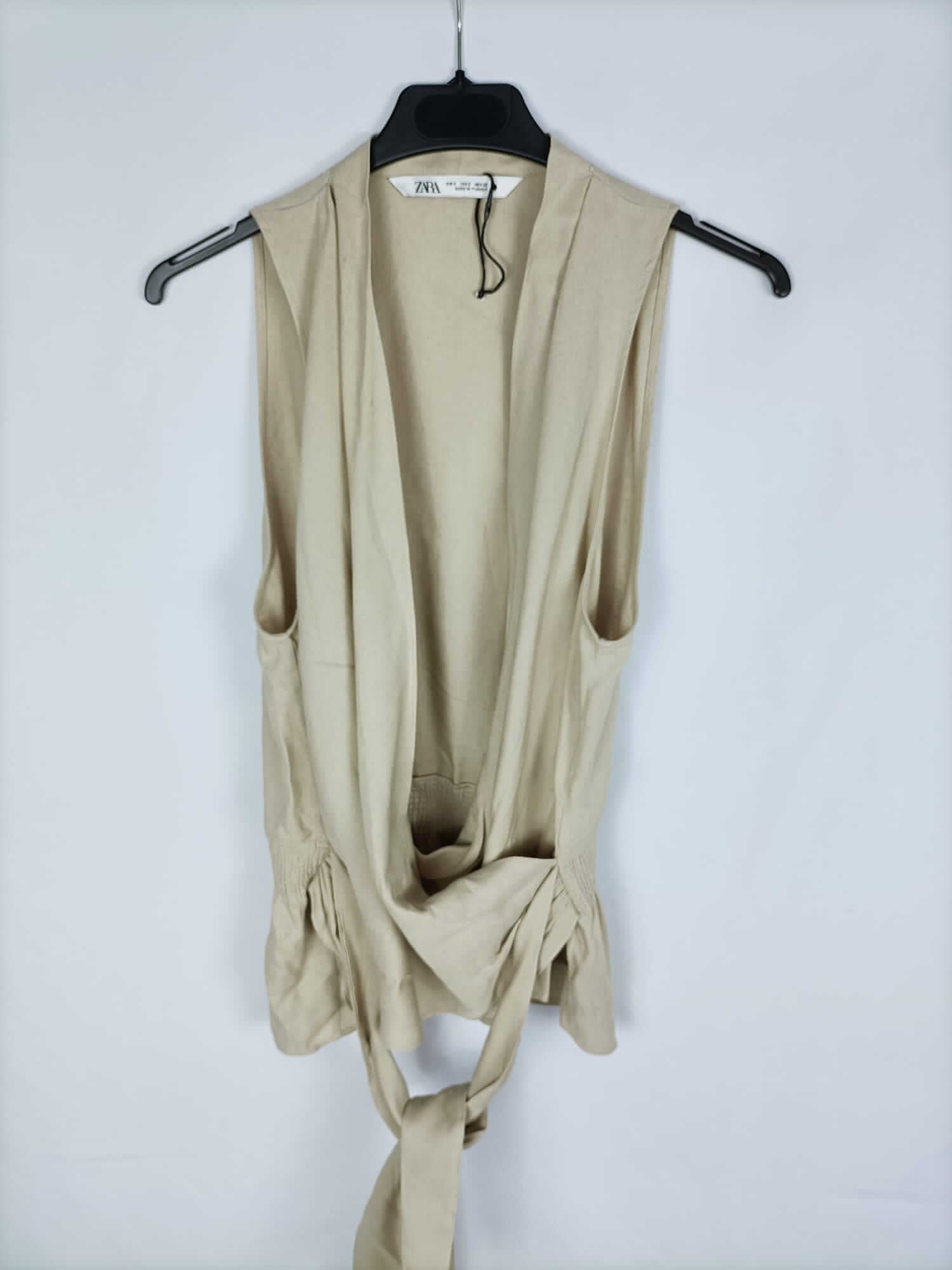 Zara. Beige linen top with a crossover neckline and bow. Elastic waist. Non-elastic. Armhole to armhole 42 cm, length 63 cm.