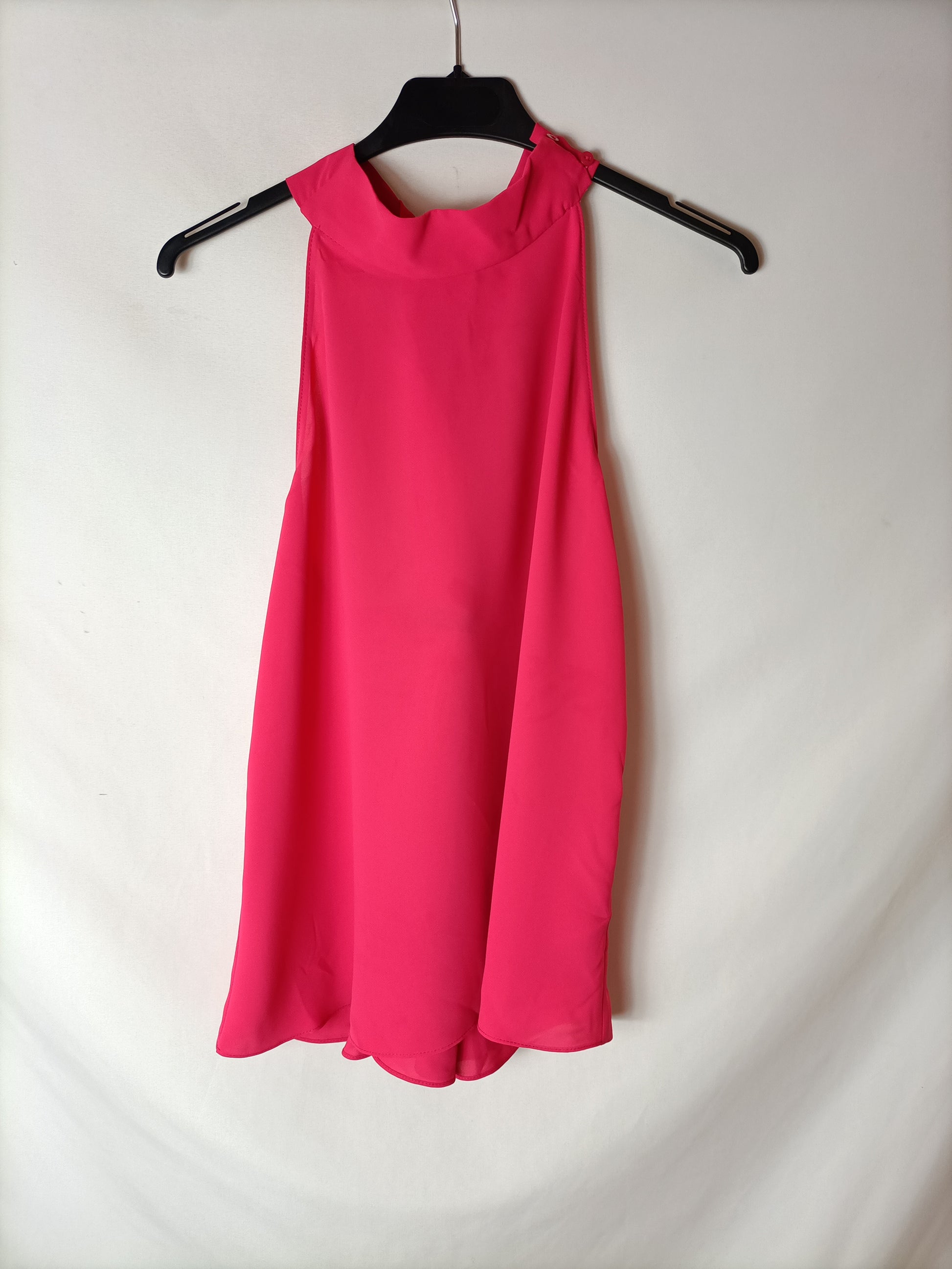 Fuchsia pink halterneck top with back detail and buttons at the neckline.