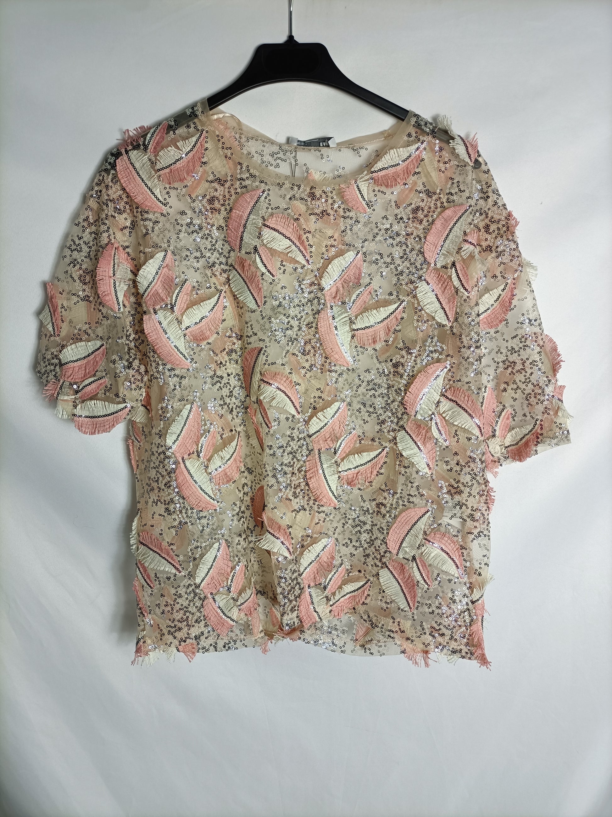 NEW WITH TAG. Sequined and fringed tulle top. Sheer.
