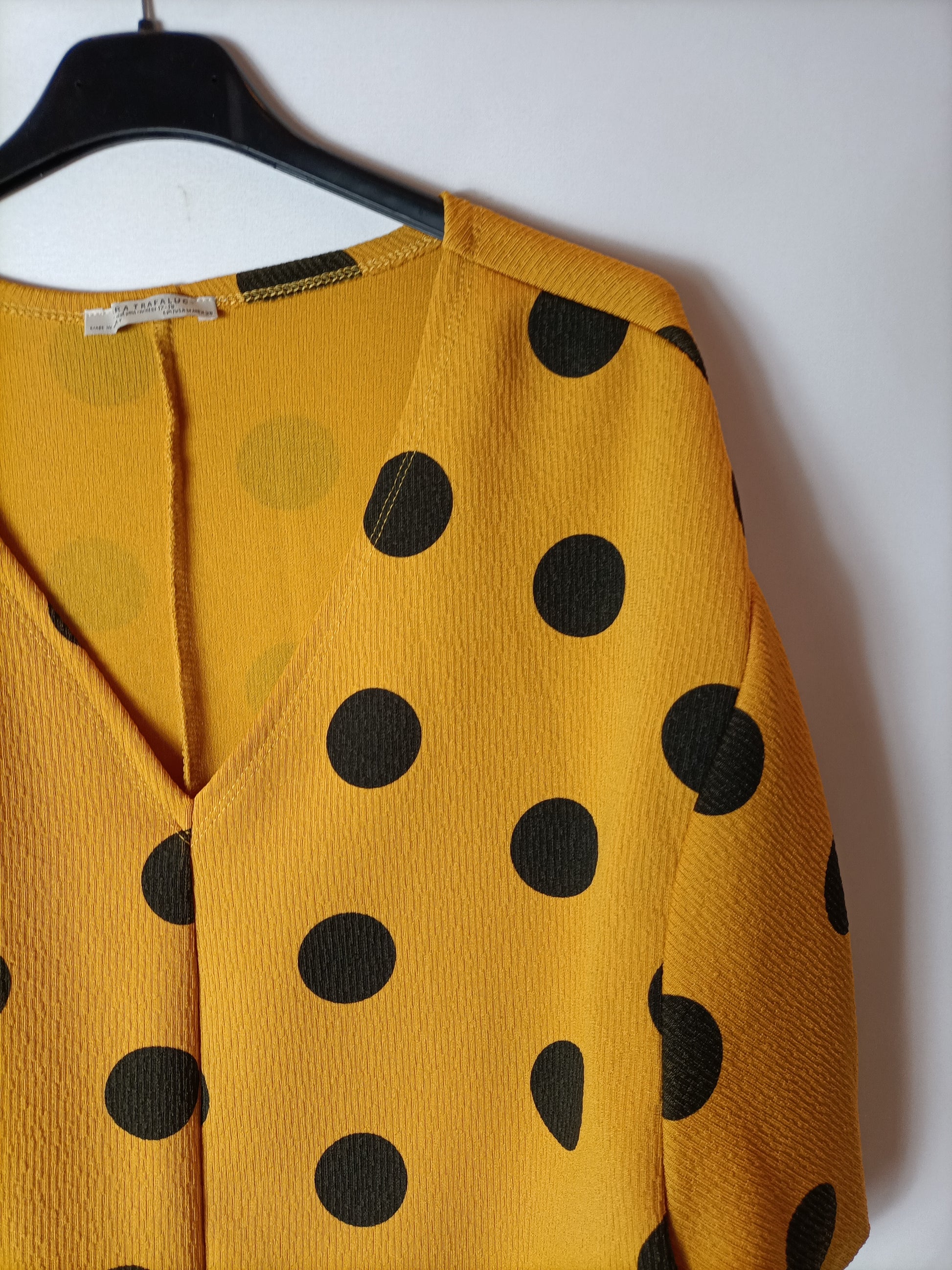 Mustard polka dot top. Slightly puffed sleeves. Stretch fabric.