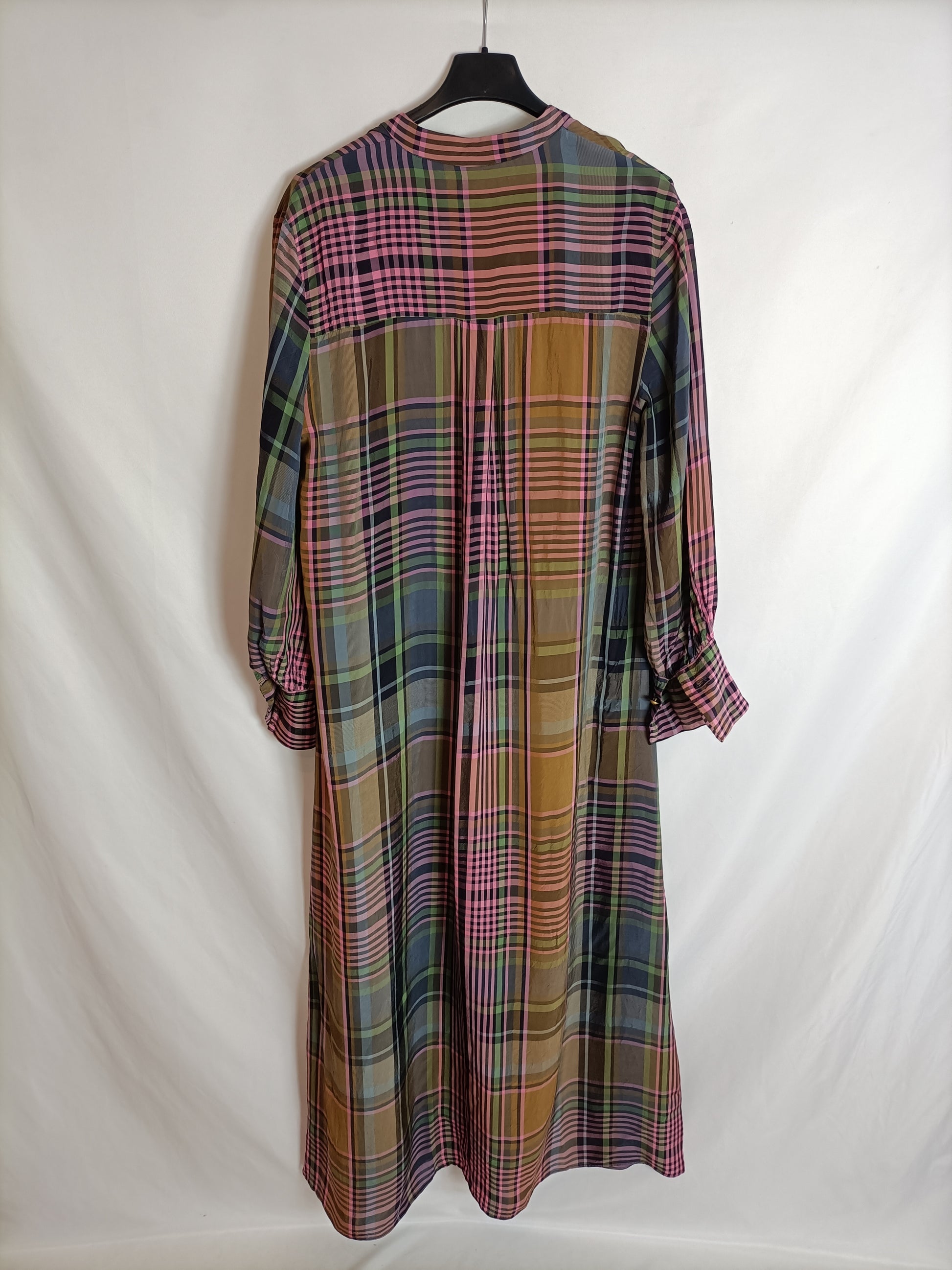 Flowy shirt-style midi dress with green and pink checks. Buttoned.