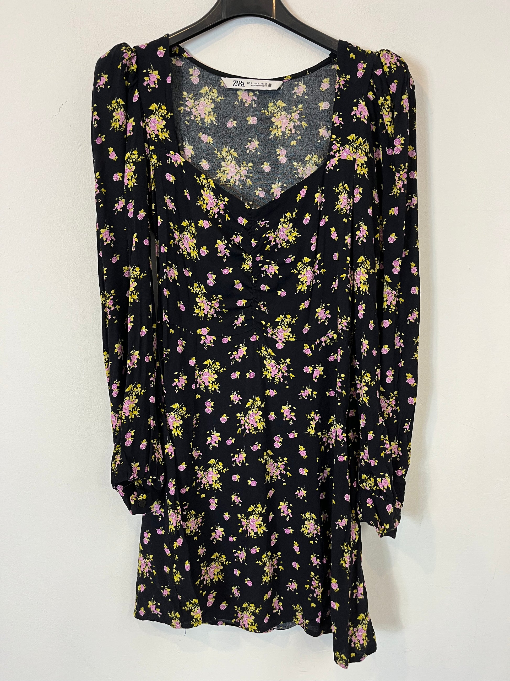 Short black floral dress. Non-stretch. Side zipper. Length 77 cm.