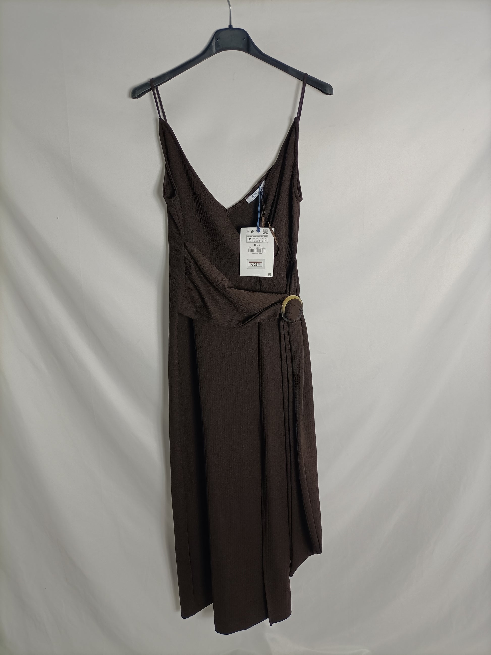 NEW WITH TAG. Brown stretch midi dress with a crossover neckline and buckle.