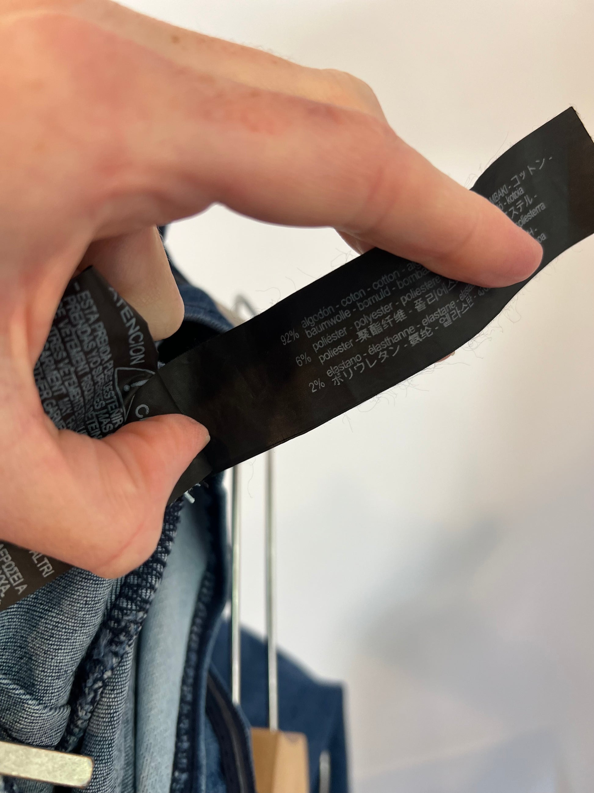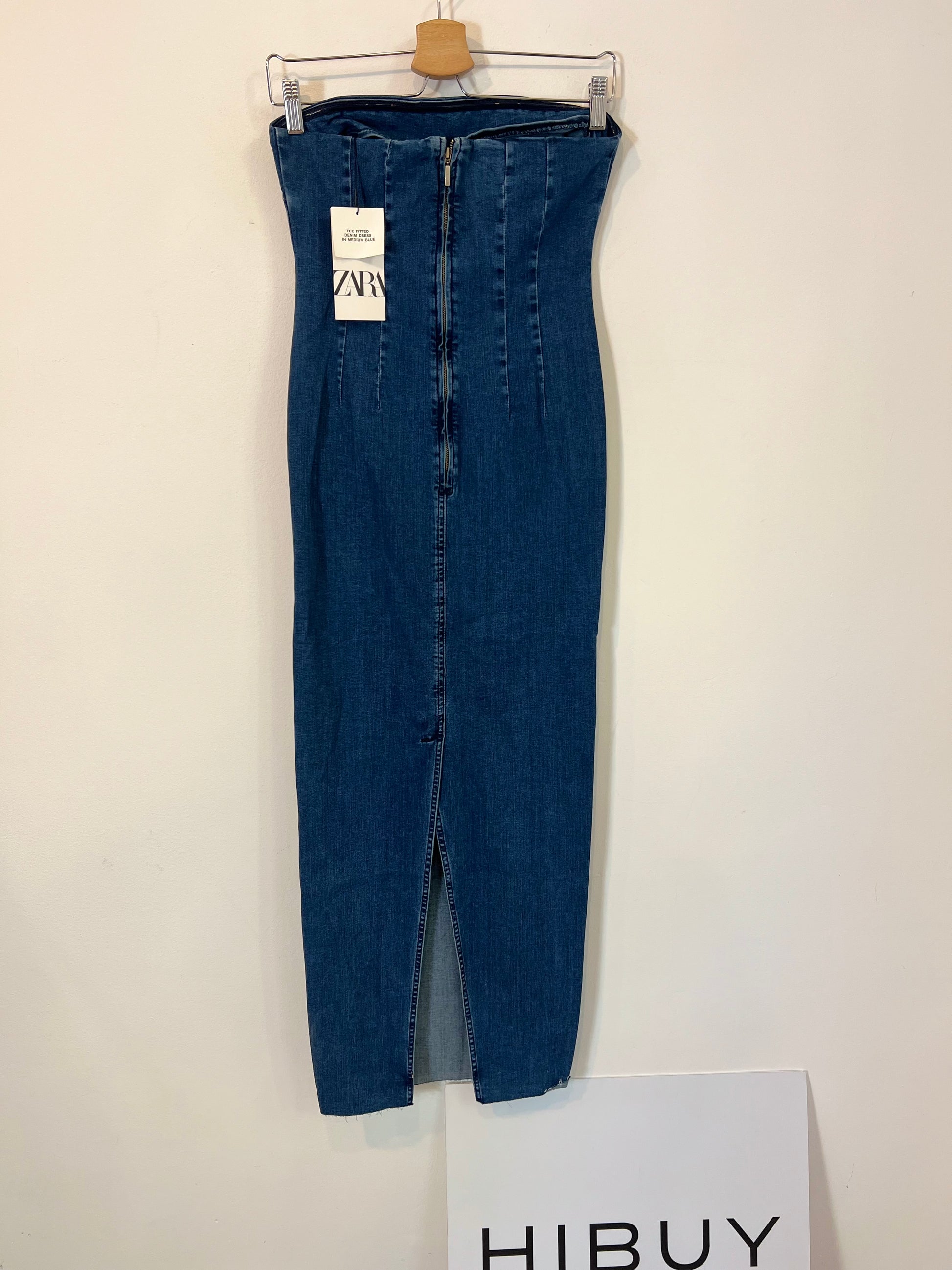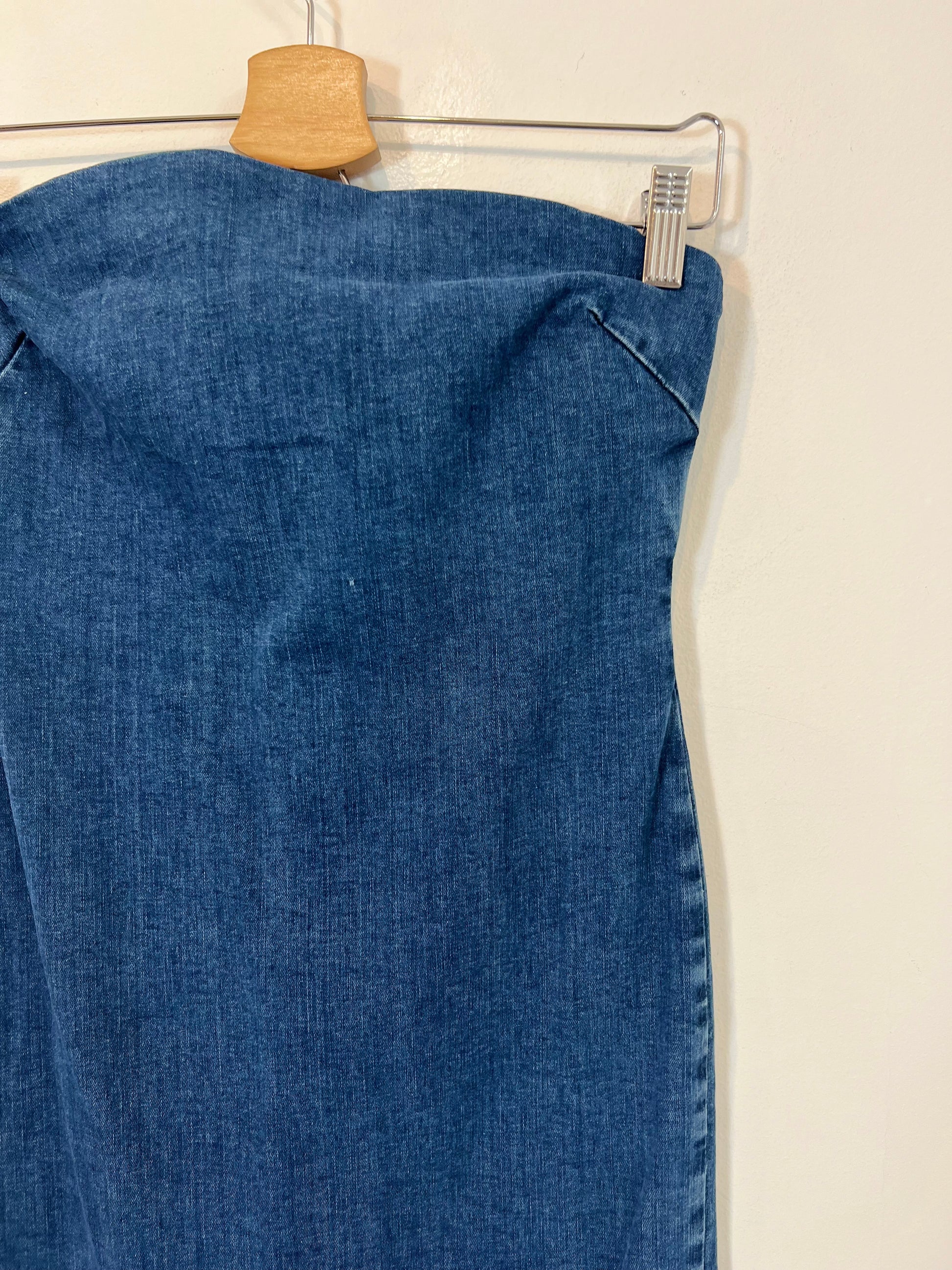 NEW CONE LABEL. Stretch strapless denim dress. Length 126 cm.