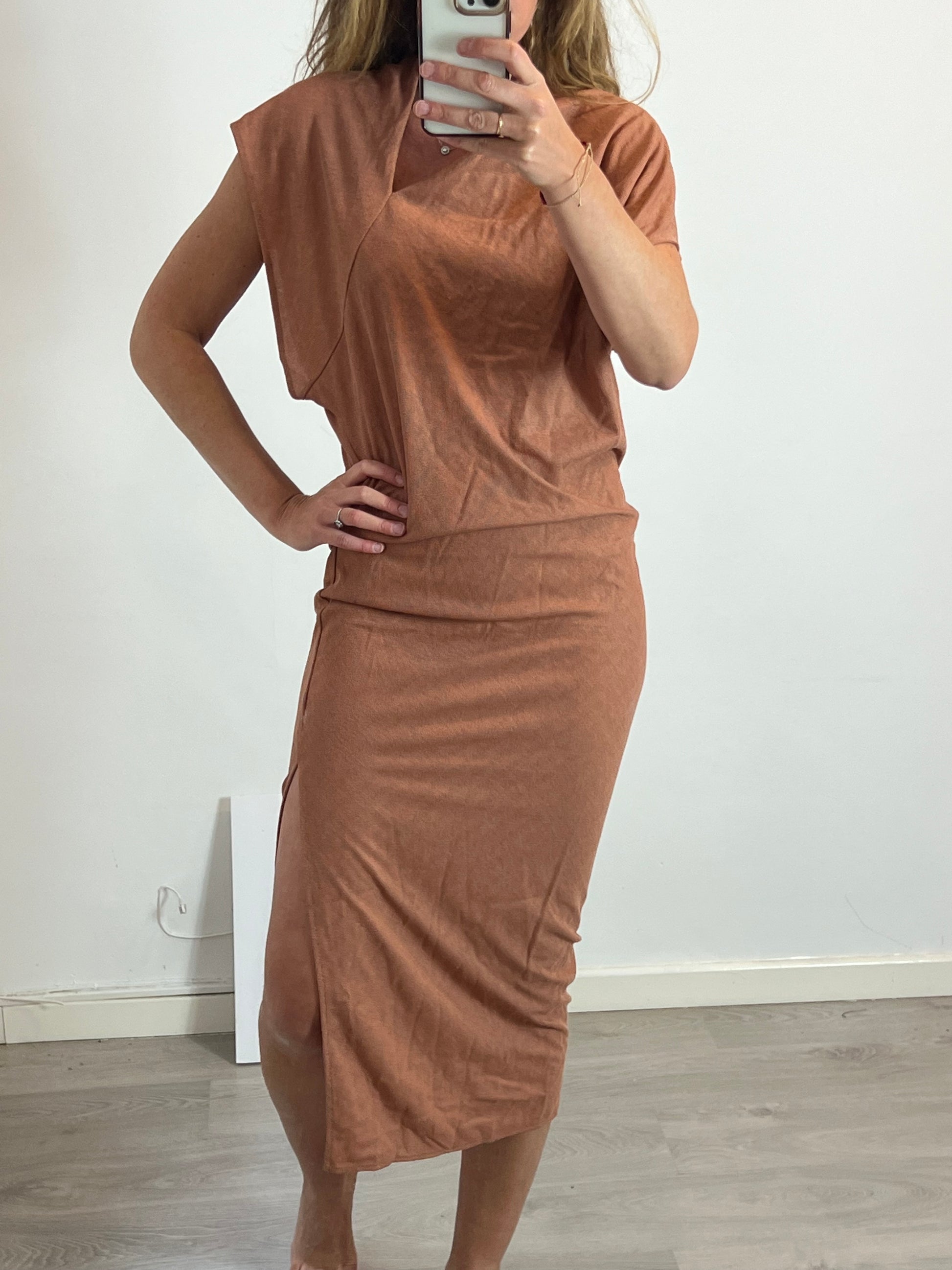 Long textured dress with asymmetrical neckline. Non-stretchy. Hips 47cm, length 132cm