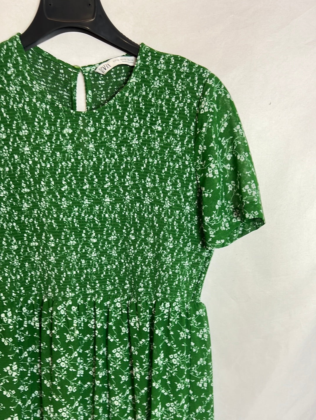 Long, flowing green dress with white flowers. Honeycomb neckline.