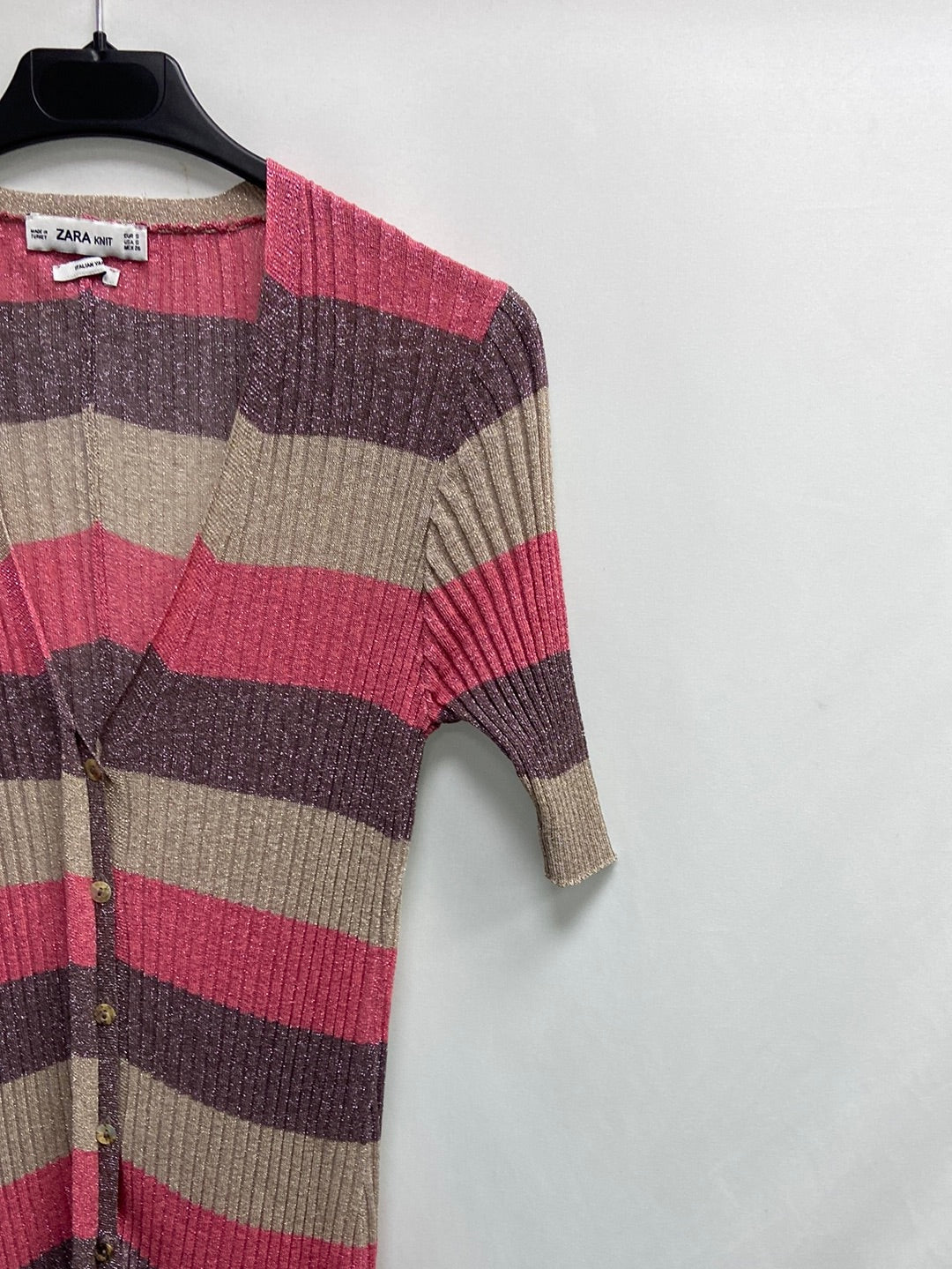 Long, tricolor striped knit dress with short sleeves and very stretchy length of 135 cm